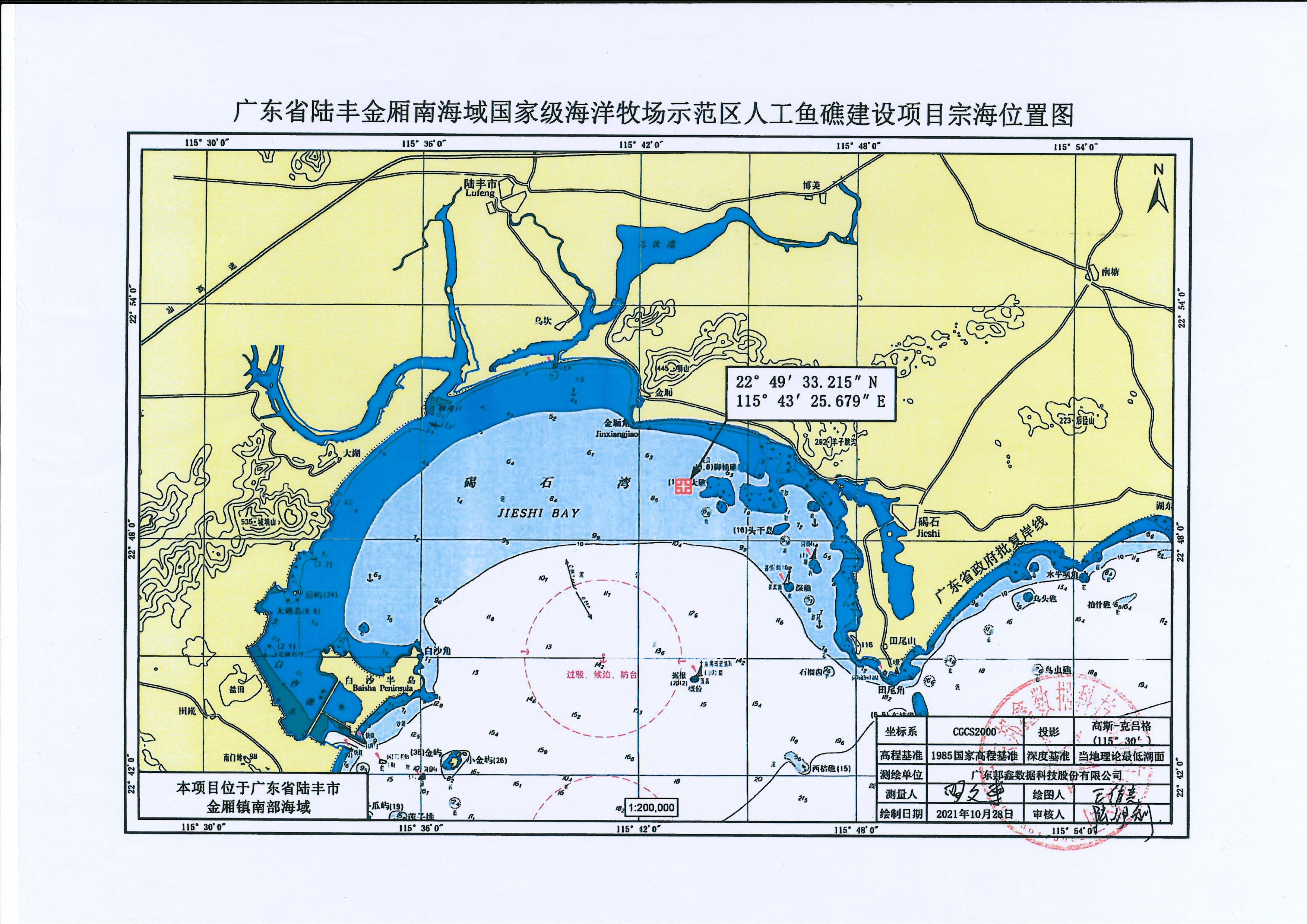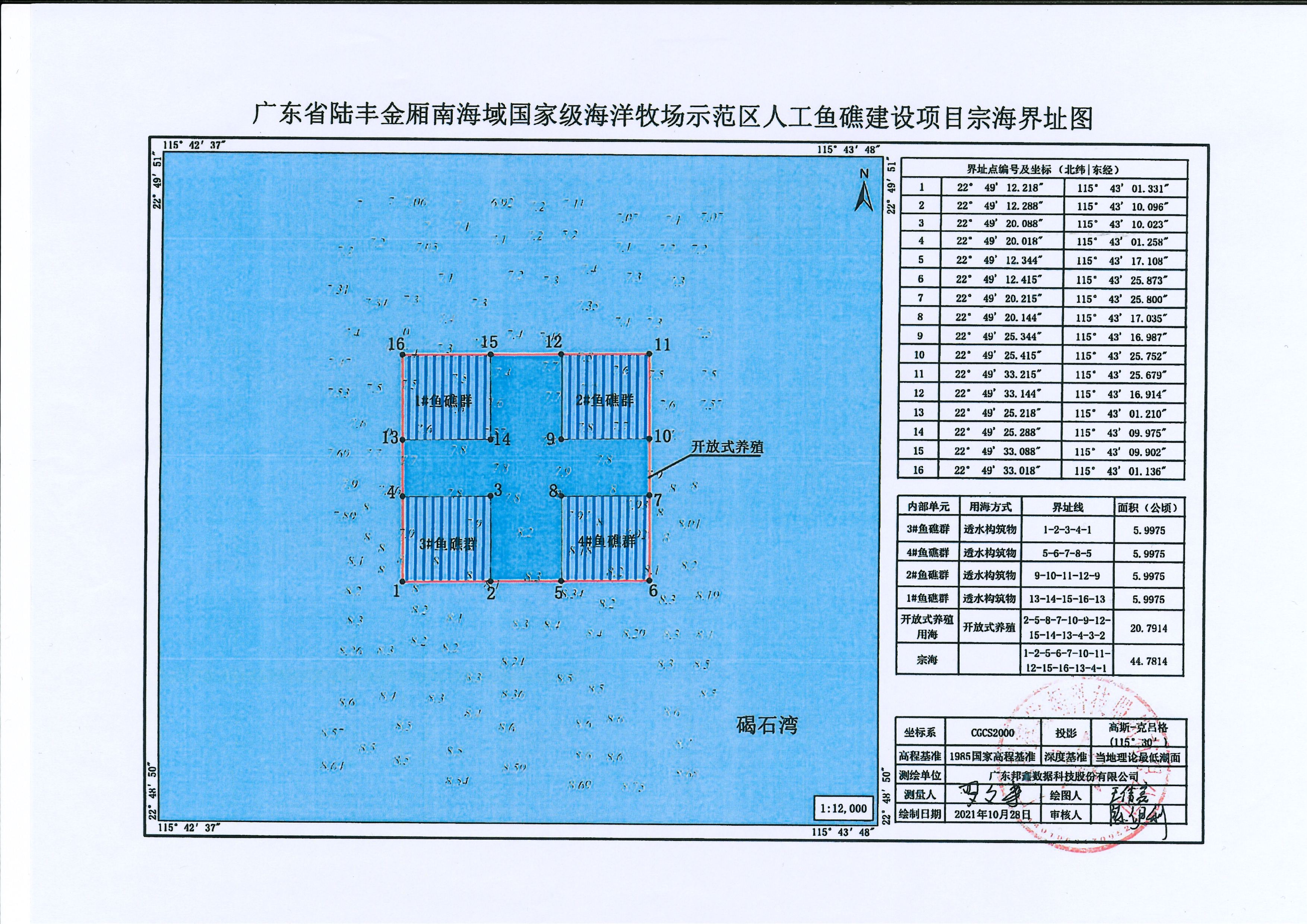 一、广东省陆丰金厢南海域国家级海洋牧场示范区人工鱼礁建设项目在苹果直播 金厢镇南侧海域广东省陆丰金厢南海域国家级海洋牧场示范区内拟申请使用海域,用海总面积44.7814公顷,其中透水构筑物用海(礁体)面积23.99公顷,开放式养殖用海面积20.7914公顷。用海类型为渔业用海中的人工鱼礁用海和开放式养殖用海,使用方式为透水构筑物用海和开放式养殖用海。本项目申请用海使用年限为40年,具体界址点及坐标见附表。