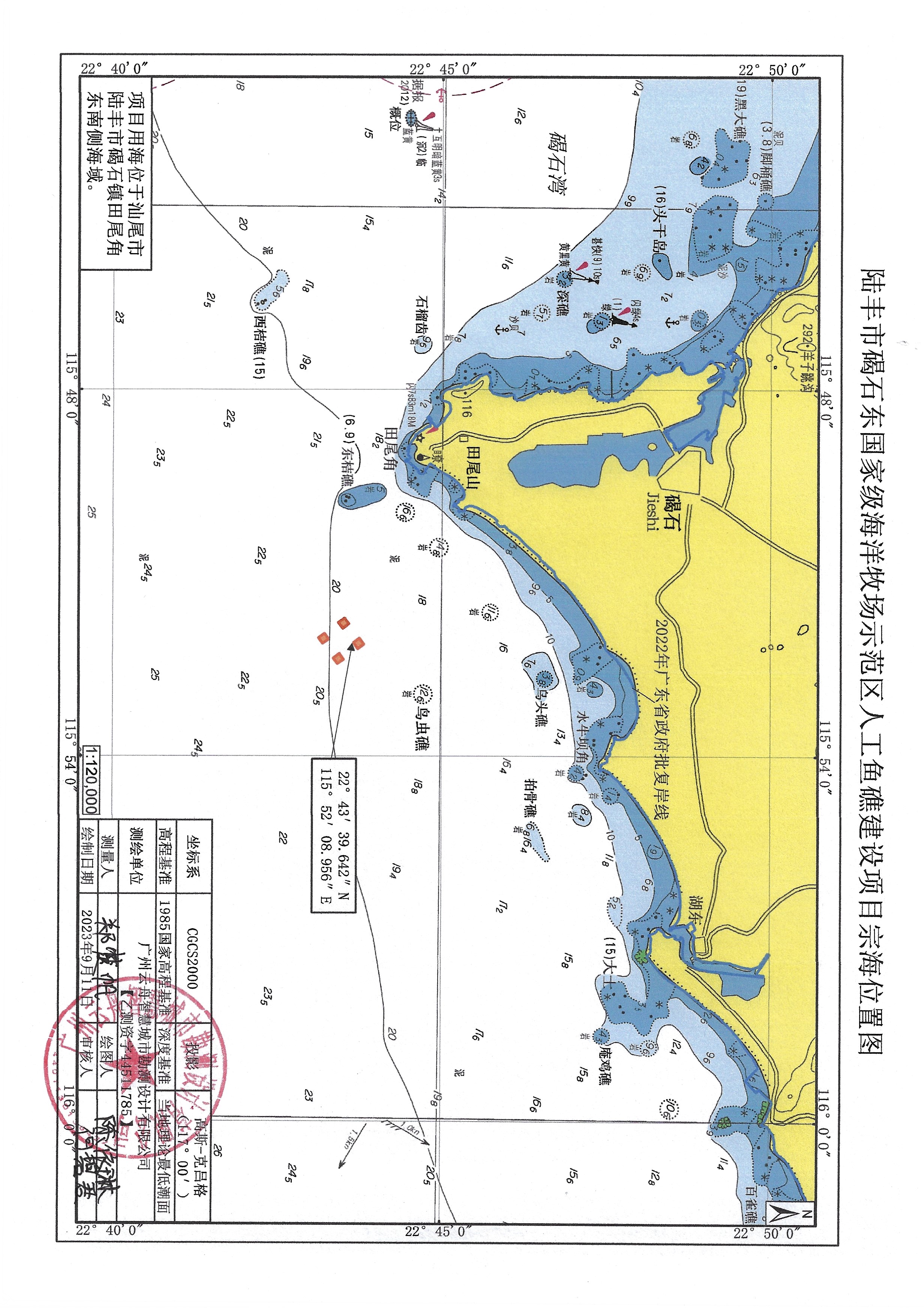 一、苹果直播 碣石东国家级海洋牧场示范区人工鱼礁建设项目位于苹果直播 碣石湾田尾山东南侧海域拟申请使用海域,用海面积为16.8458公顷,用海类型为渔业用海中的人工鱼礁用海,使用方式为构筑物用海中的透水构筑物用海,用海申请期限为15年。具体界址点及坐标见附件。