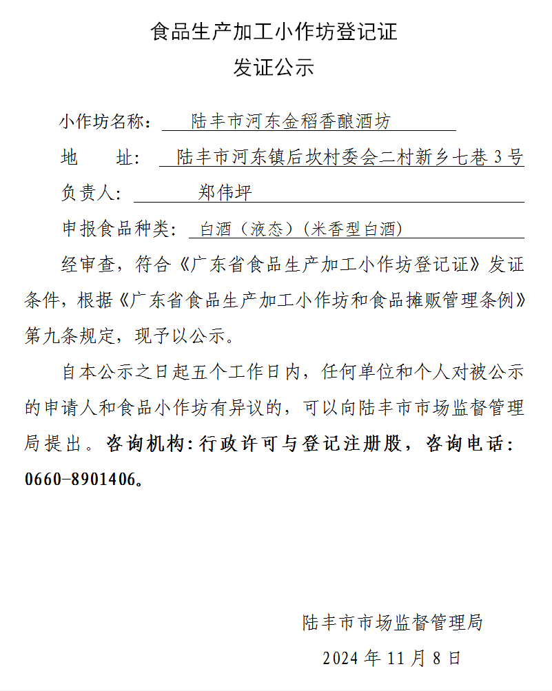 符合《广东省食品生产加工小作坊登记证》发证条件,根据《广东省食品生产加工小作坊和食品摊贩管理条例》第九条规定,现予以公示。
