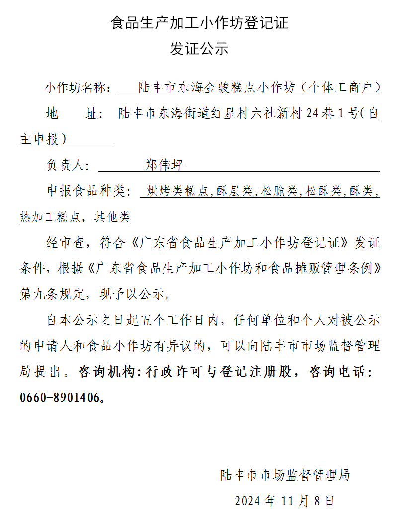 经审查,苹果直播 东海金骏糕点小作坊(个体工商户)符合《广东省食品生产加工小作坊登记证》发证条件,根据《广东省食品生产加工小作坊和食品摊贩管理条例》第九条规定,现予以公示。