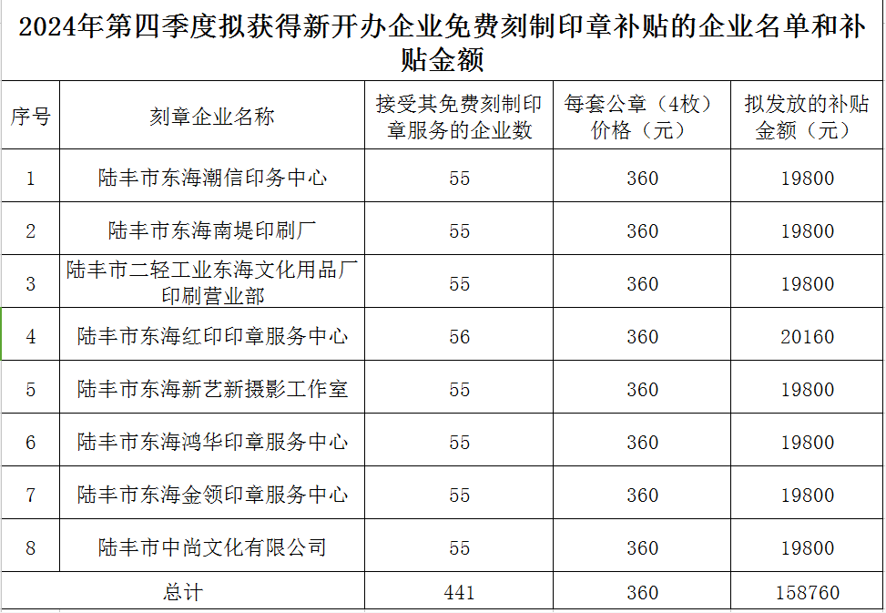 2024年第四季度拟获得新开办企业免费刻制印章补贴的企业名单和补贴金额