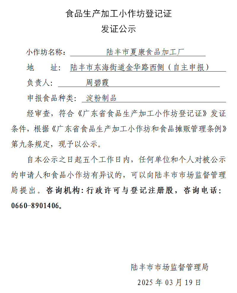 食品生产加工小作坊登记证发证公示