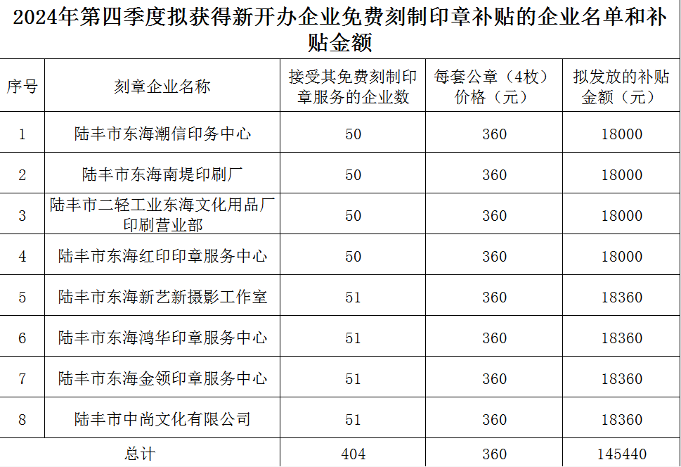 2025年第一季度拟获得新开办企业免费刻制印章补贴的企业名单和补贴金额