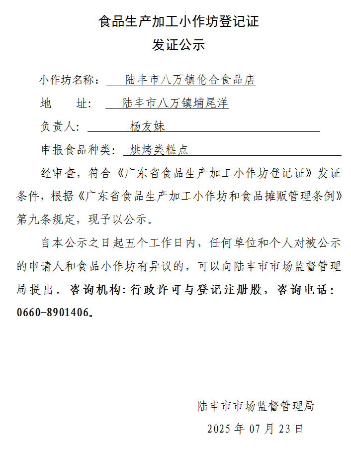 食品生产加工小作坊登记证发证公示
