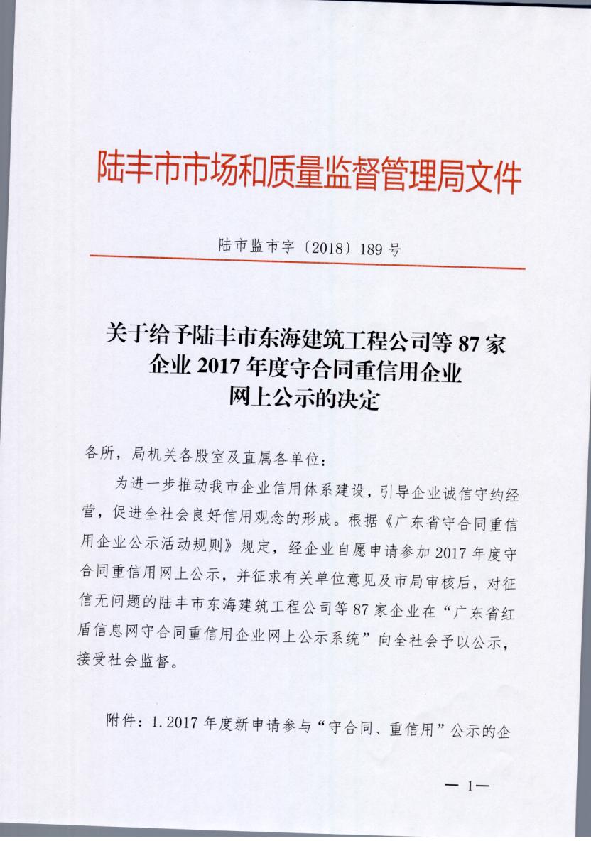 关于给予苹果直播 东海建筑工程公司等87家企业2017年度守合同重信用企业网上公示的决定