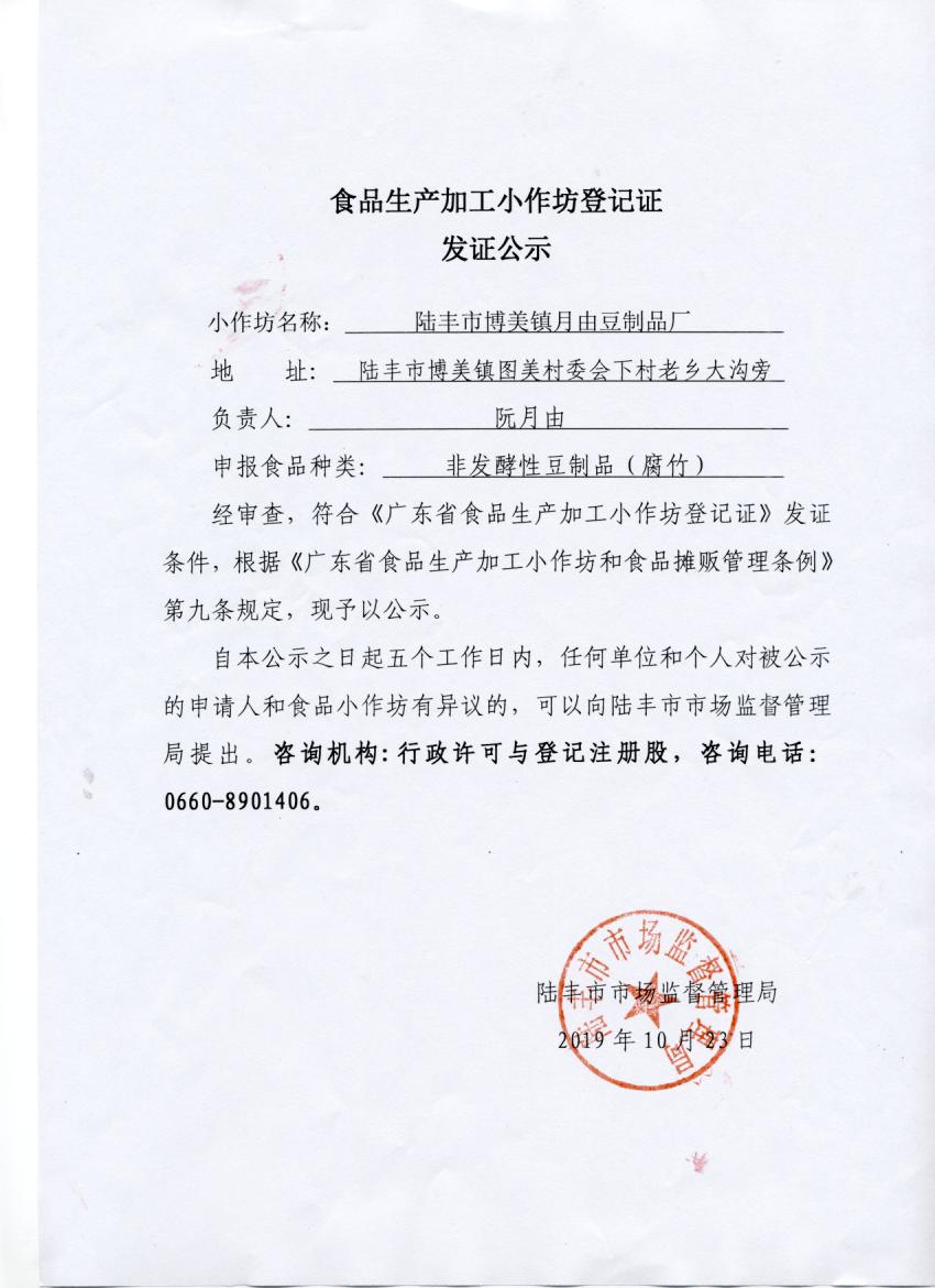 食品生产加工小作坊登记证发证公示(苹果直播 博美镇月由豆制品厂)