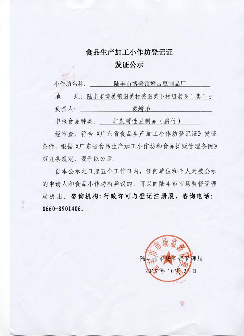 食品生产加工小作坊登记证发证公示(苹果直播 博美镇增吉豆制品厂)
