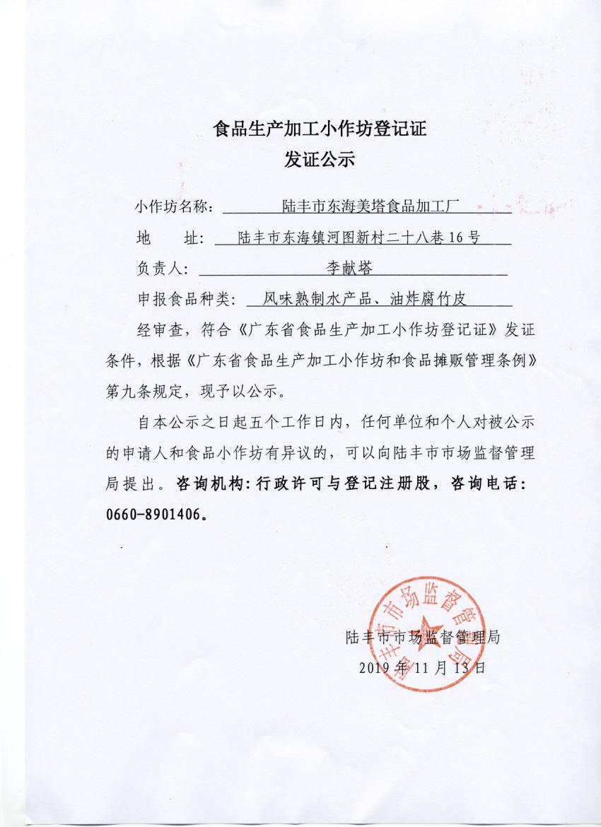 食品生产加工小作坊登记证发证公示(苹果直播 东海美塔食品加工厂)