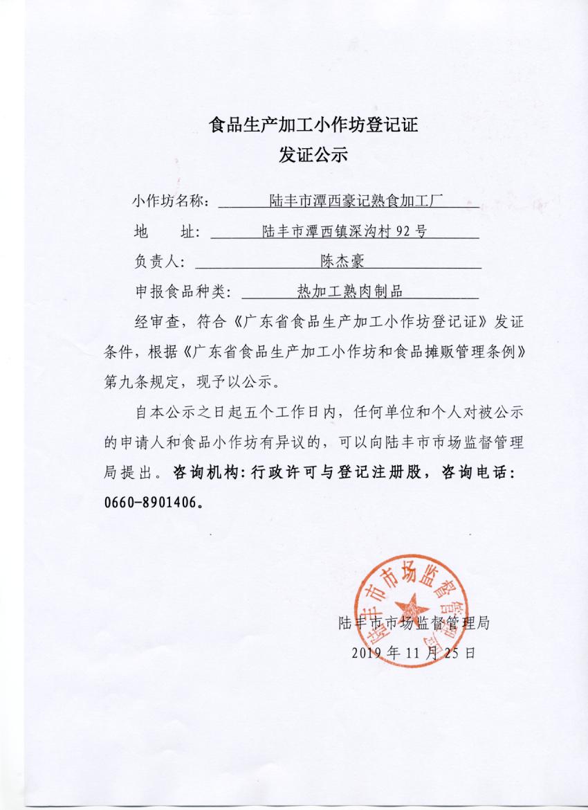 食品生产加工小作坊登记证发证公示(苹果直播 潭西豪记熟食加工厂)