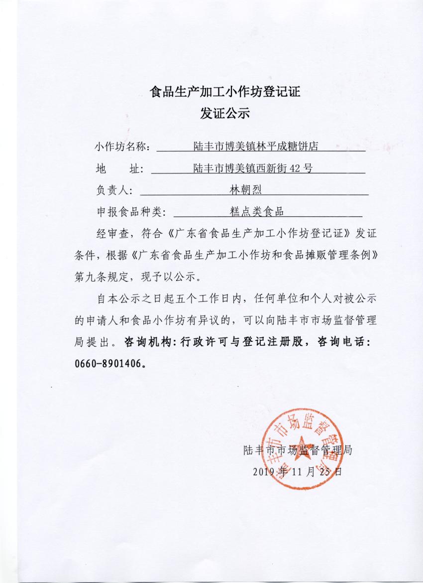食品生产加工小作坊登记证发证公示(苹果直播 博美镇林平成糖饼店)