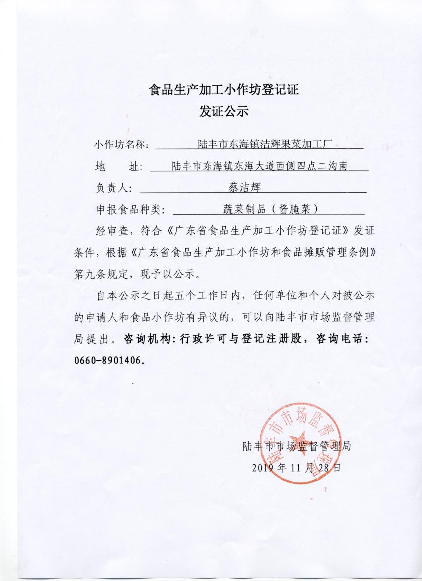 食品生产加工小作坊登记证发证公示(苹果直播 东海镇洁辉果菜加工厂)