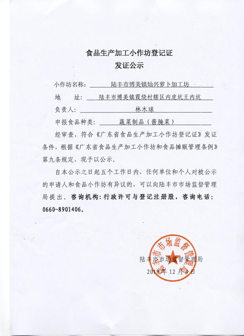 食品生产加工小作坊登记证发证公示(苹果直播 博美镇灿兴萝卜加工坊)