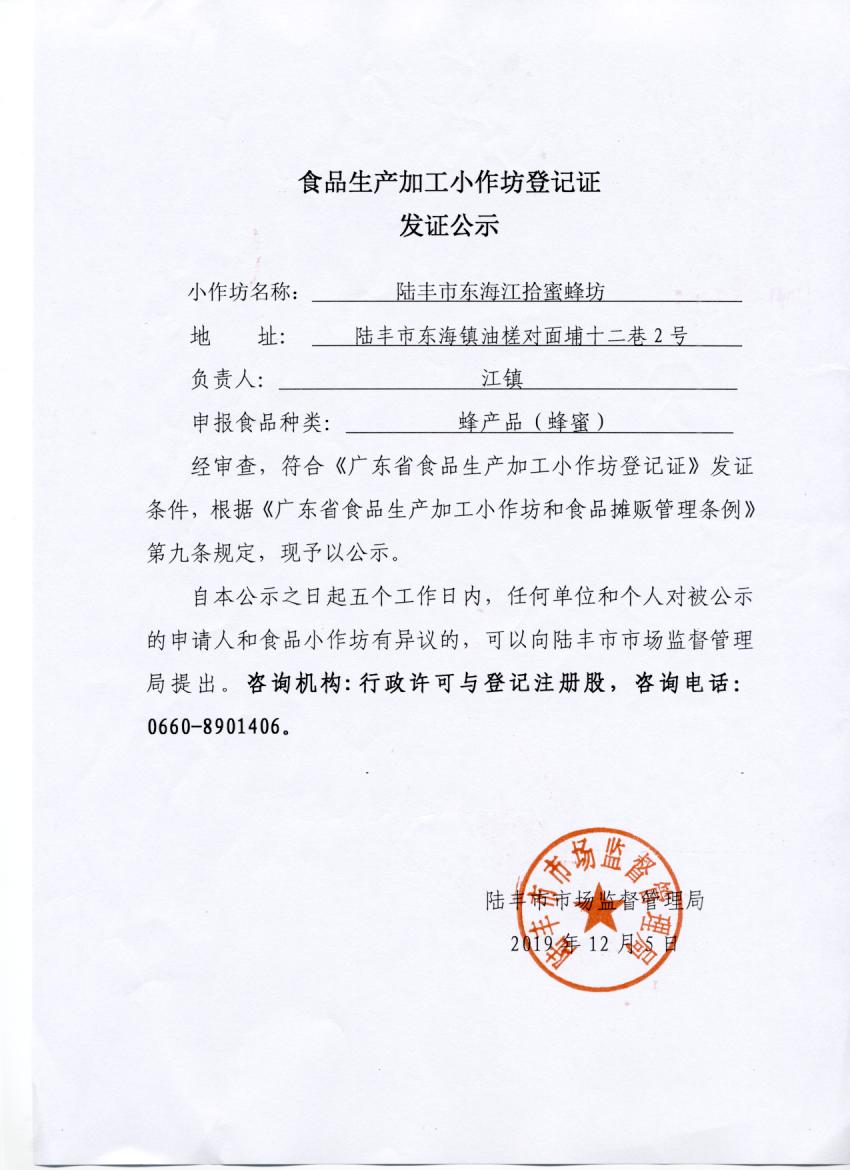 食品生产加工小作坊登记证发证公示(苹果直播 东海江拾蜜蜂坊)