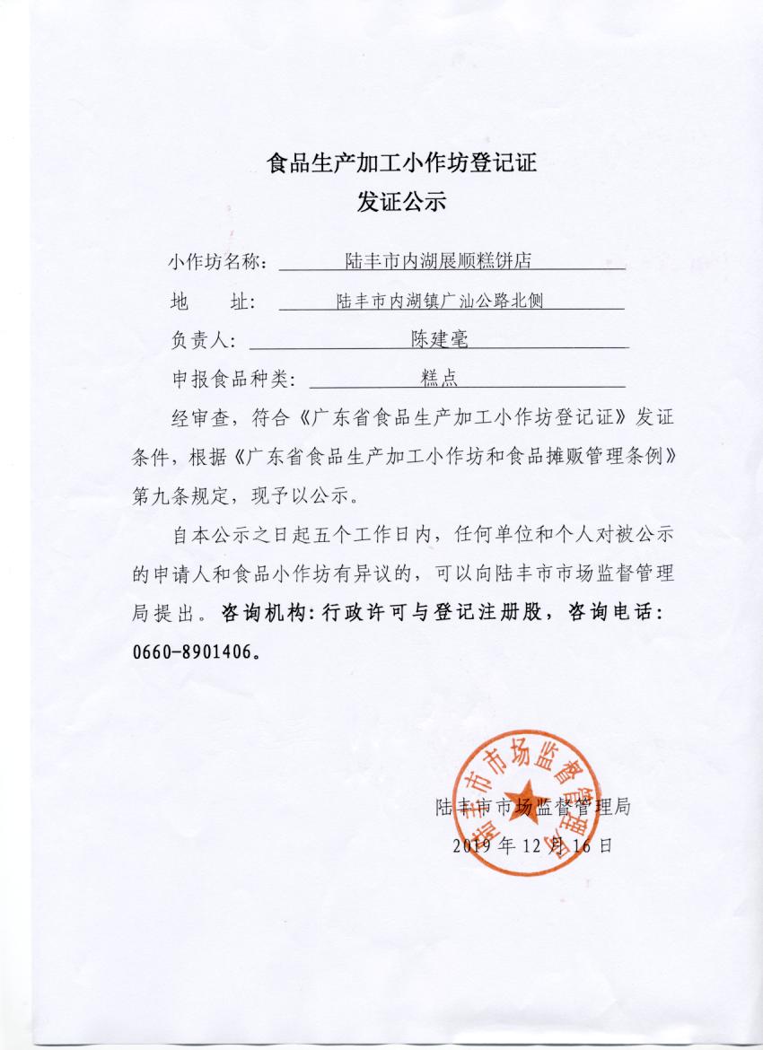 食品生产加工小作坊登记证发证公示(苹果直播 内湖展顺糕饼店)