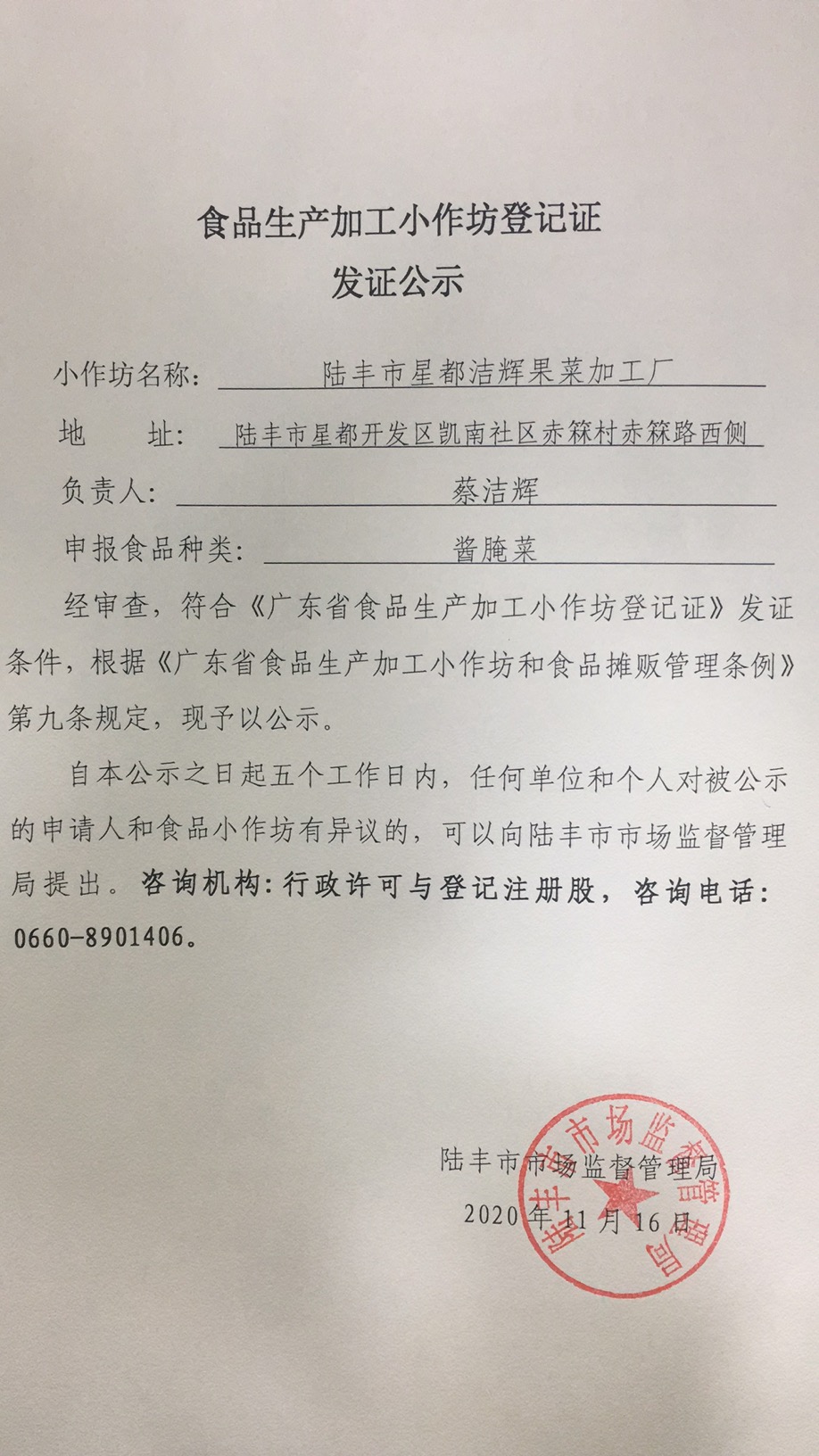食品生产加工小作坊登记证发证公示(苹果直播 星都洁辉果菜加工厂)