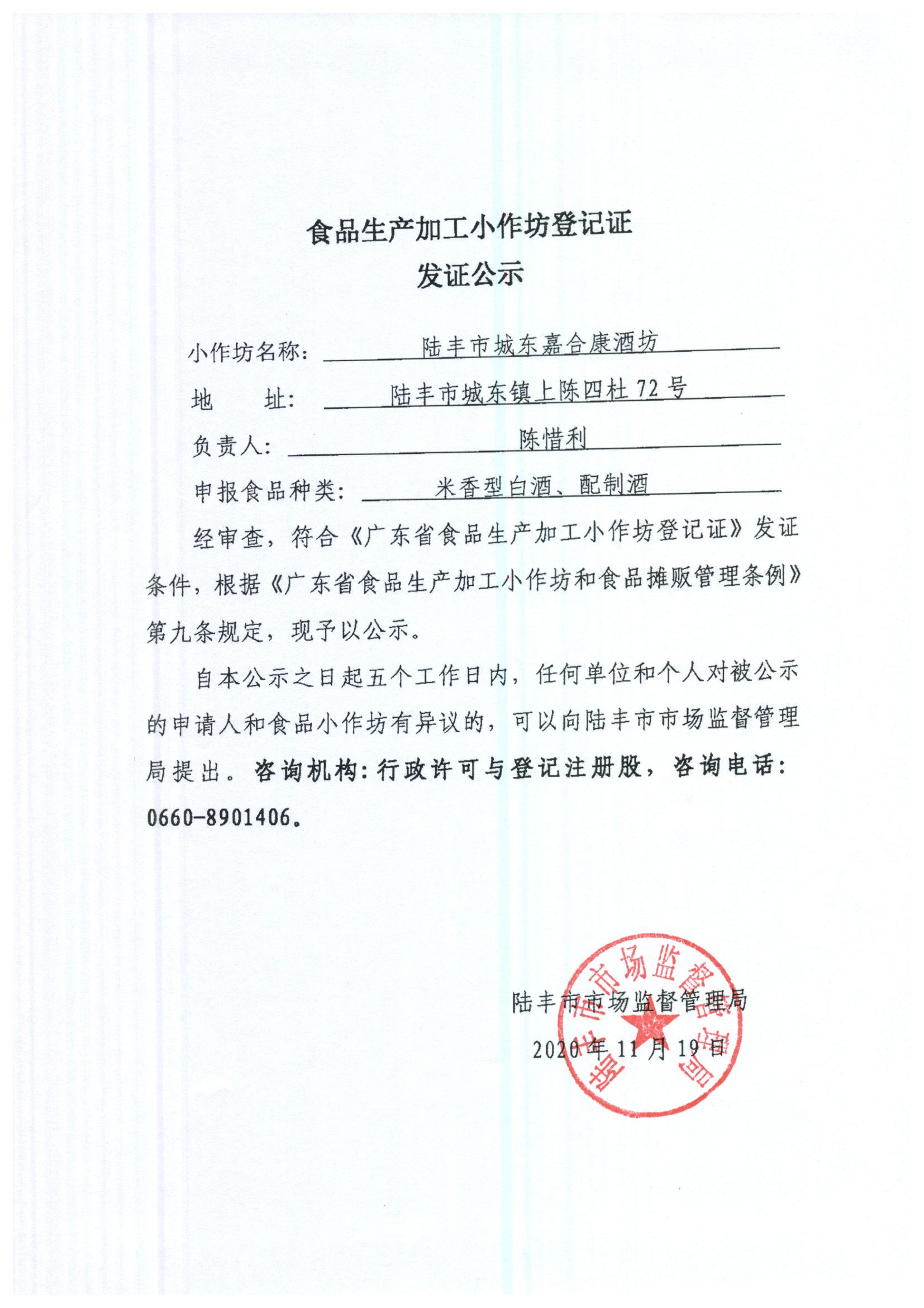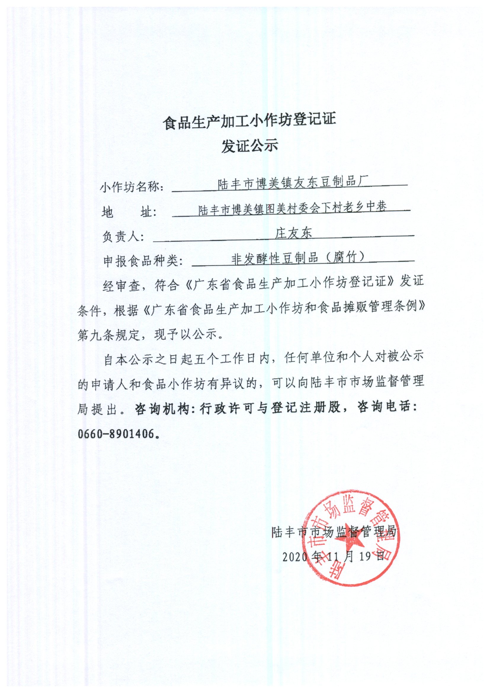 食品加工小作坊登记证发证公示