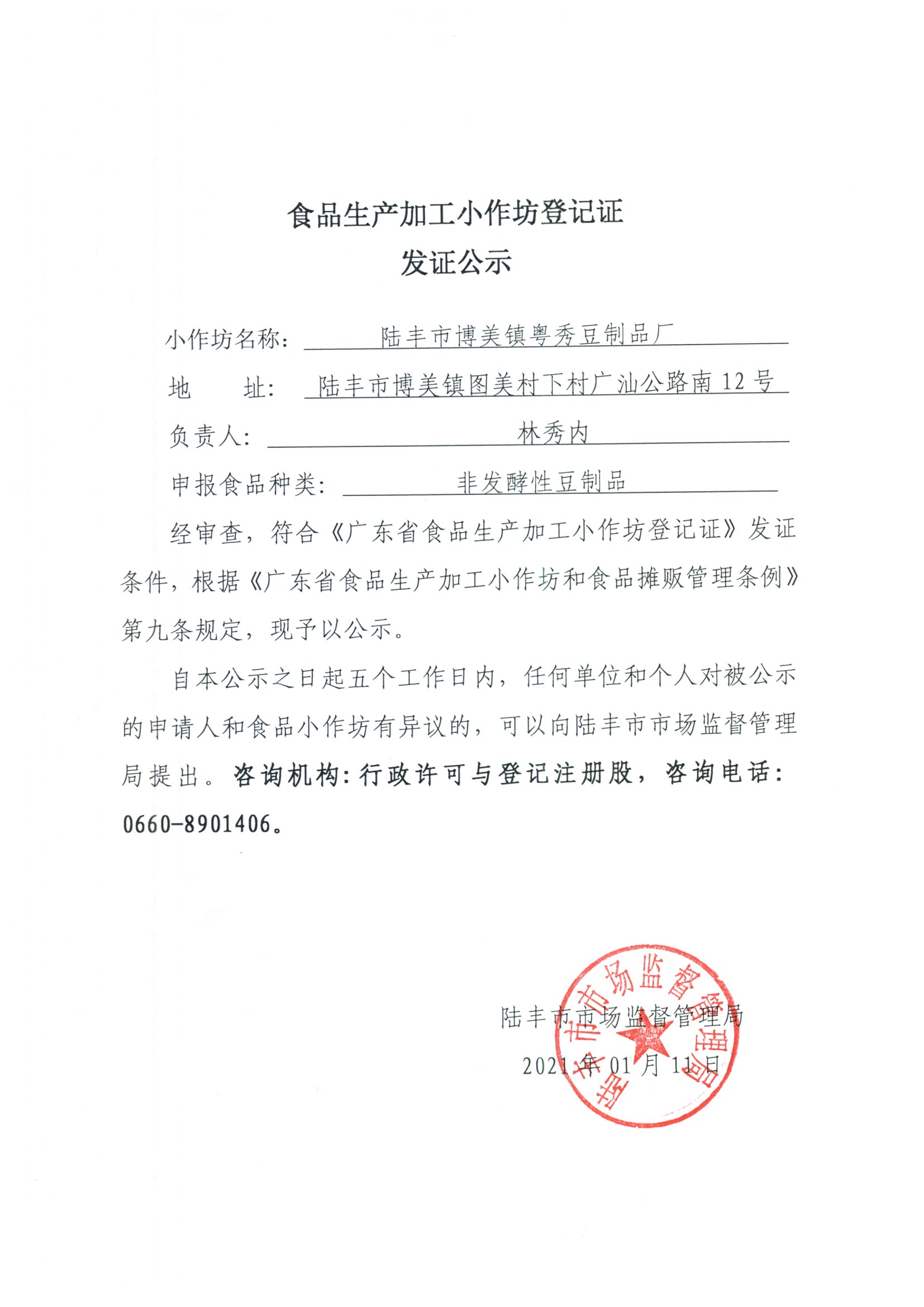 食品生产加工小作坊登记证发证公示