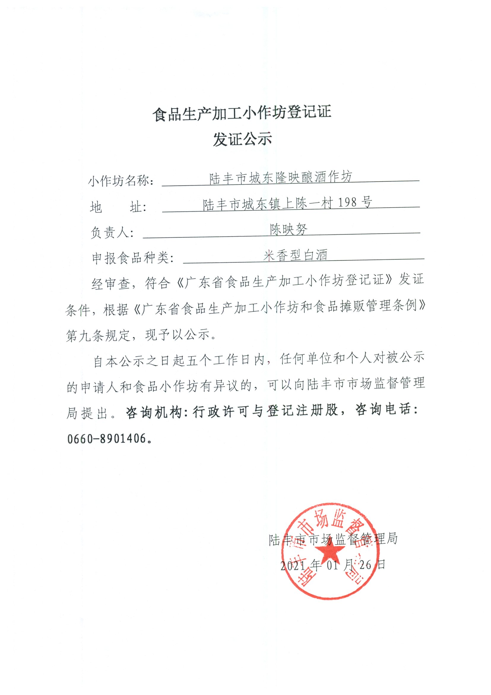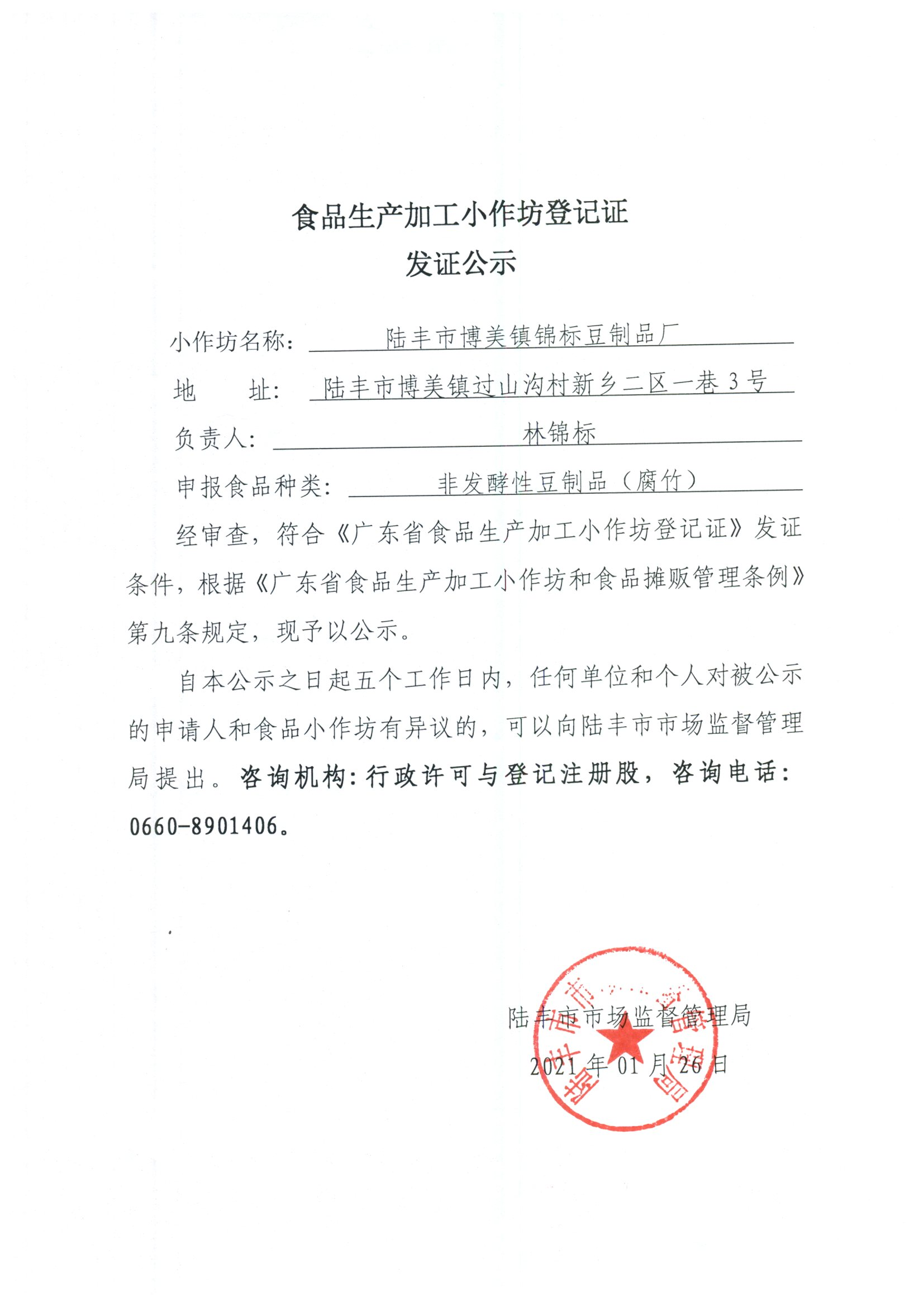 经审查,苹果直播 博美镇锦标豆制品厂等3户小作坊符合《广东省食品生产加工小作坊登记证》发证条件,根据《广东省食品生产加工小作坊和食品摊贩管理条例》第九条规定,现予以公示。