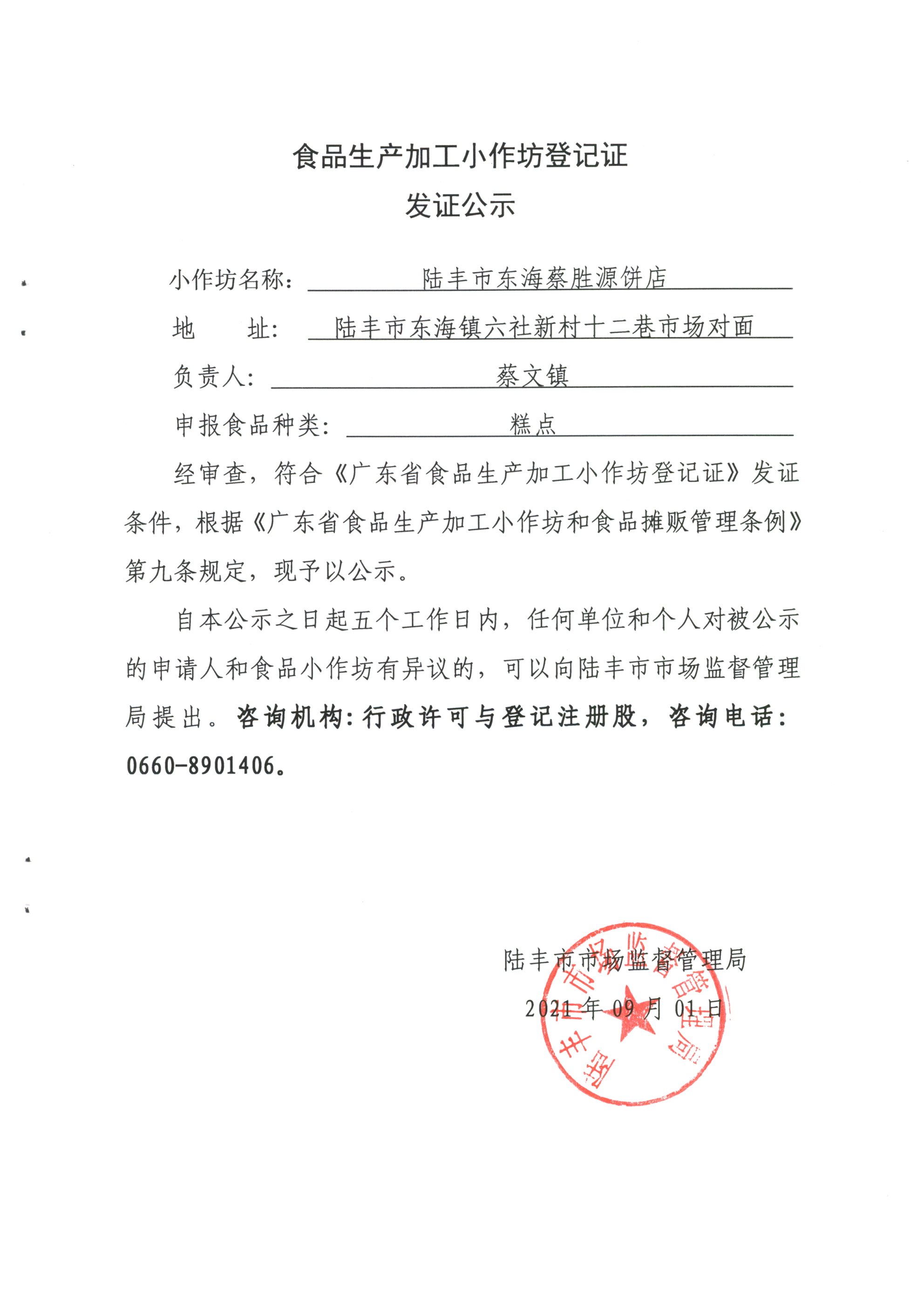经审查,苹果直播 东海蔡胜源饼店符合《广东省食品生产加工小作坊登记证》发证条件,根据《广东省食品生产加工小作坊和食品摊贩管理条例》第九条规定,现予以公示。