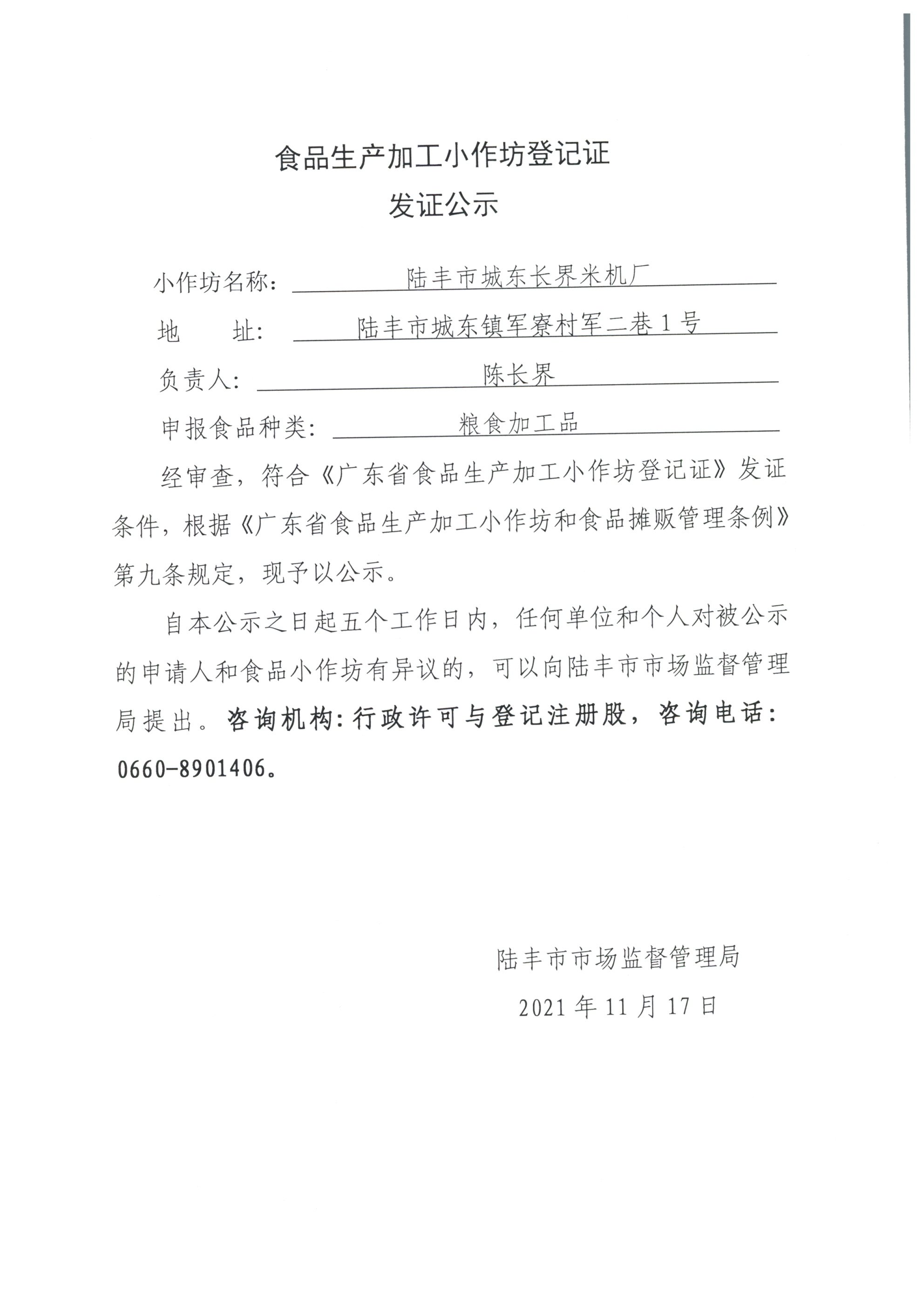 经审查,苹果直播 城东长界米机厂符合《广东省食品生产加工小作坊登记证》发证条件,根据《广东省食品生产加工小作坊和食品摊贩管理条例》第九条规定,现予以公示。