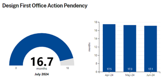 据悉,美国外观设计专利通常比获得实用新型专利更快,但目前美国的外观设计专利申请的审查周期仍然较长。根据美国专利商标局(USPTO)2024年7月发布的数据,在过去一年中,从外观设计申请提交日期到第一次审查意见寄出日期的平均时间为16.7个月(下图1)。在2024年7月,这一平均值已攀升至17.1个月。尤其是在消费品领域,考虑到产品更新换代较快,如此长的审查周期可能不适合外观设计专利申请人。
