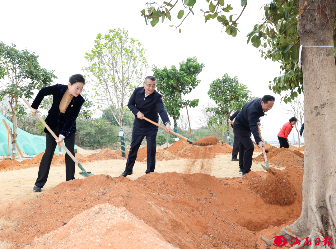 初春的品清湖畔惠风和畅、草木同苏,植树现场一片繁忙。逯峰、郑海涛等市领导同志拿起铁锹等工具走向植树点,与干部群众、驻汕部队官兵一起,挥锹铲土、扶直树苗、培土围堰、提水浇灌,合力种下花叶高山榕、黄花风铃木、秋枫等一批特色乡土乔木。一株株新植树苗错落有致、迎风挺立,为汕尾大地增添了清新绿意和勃勃生机。