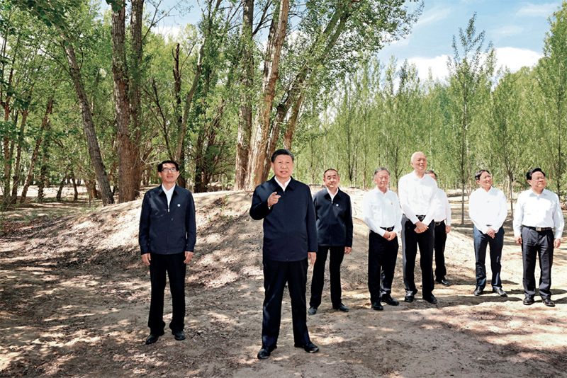 2023年6月5日至6日,中共中央总书记、国家主席、中央军委主席习近平在内蒙古巴彦淖尔考察,并主持召开加强荒漠化综合防治和推进“三北”等重点生态工程建设座谈会。这是6日上午,习近平在临河区国营新华林场考察。图片来源:新华网