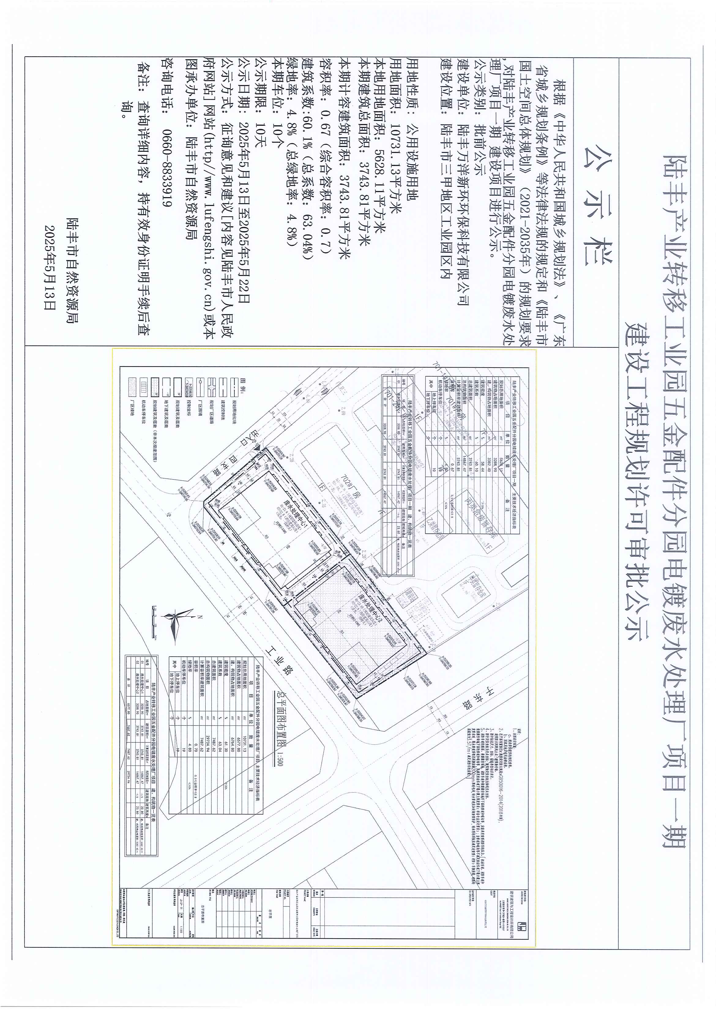 陆丰产业转移工业园五金配件分园电镀废水处理厂项目一期建设工程规划许可审批公示