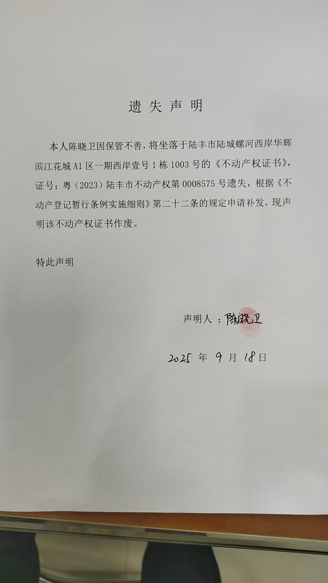不动产权第0008575号遗失,根据《不动产登记暂行条例实施细则》第二十二条的规定申请补发,现声明该不动产权证书作废。