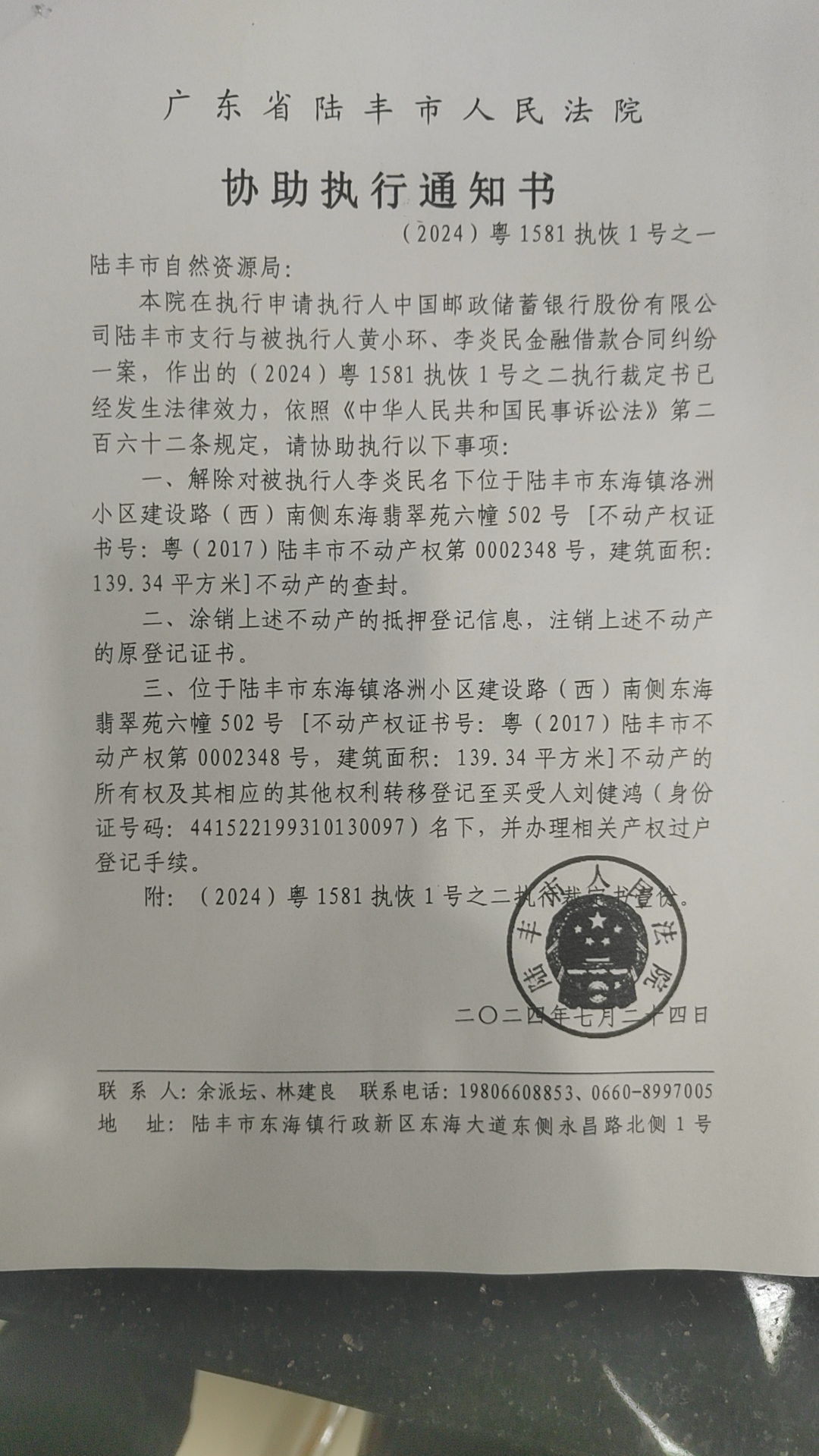 苹果直播 人民法院(2024)粤1581执恢1号之一协助执行通知书。