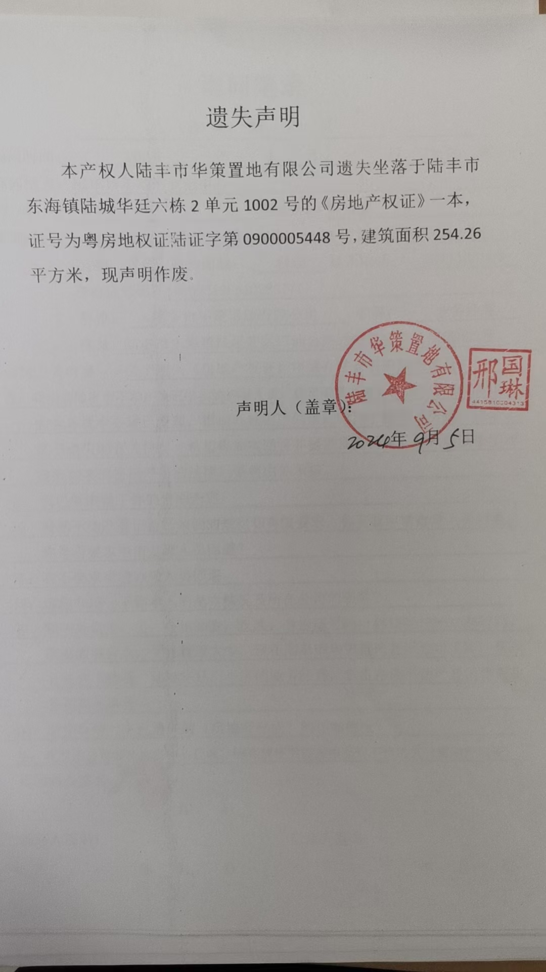 遗失声明工:本产权人苹果直播 华策置地有限公司遗失坐落于苹果直播 东海镇陆城华廷六栋2单元1002号的《房地产权证》一本,证号为粤房地权证陆证字第0900005448号,建筑面积254.26平方米,现声明作废。