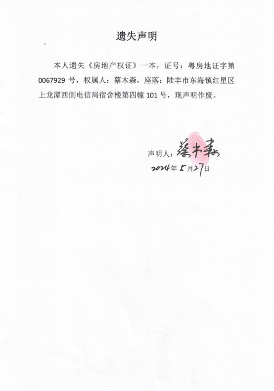蔡木森因《房地产权证》遗失向我局申请补发新证书,根据《不动产登记暂行条例实施细则》第二十二条的规定,现公告作废,如有异议,请自本公告之日起十五个工作日内(2024年9月29日之前)将异议书面材料送达我机构,逾期无人提出异议或者异议不成立的,我机构将予以补证登记。