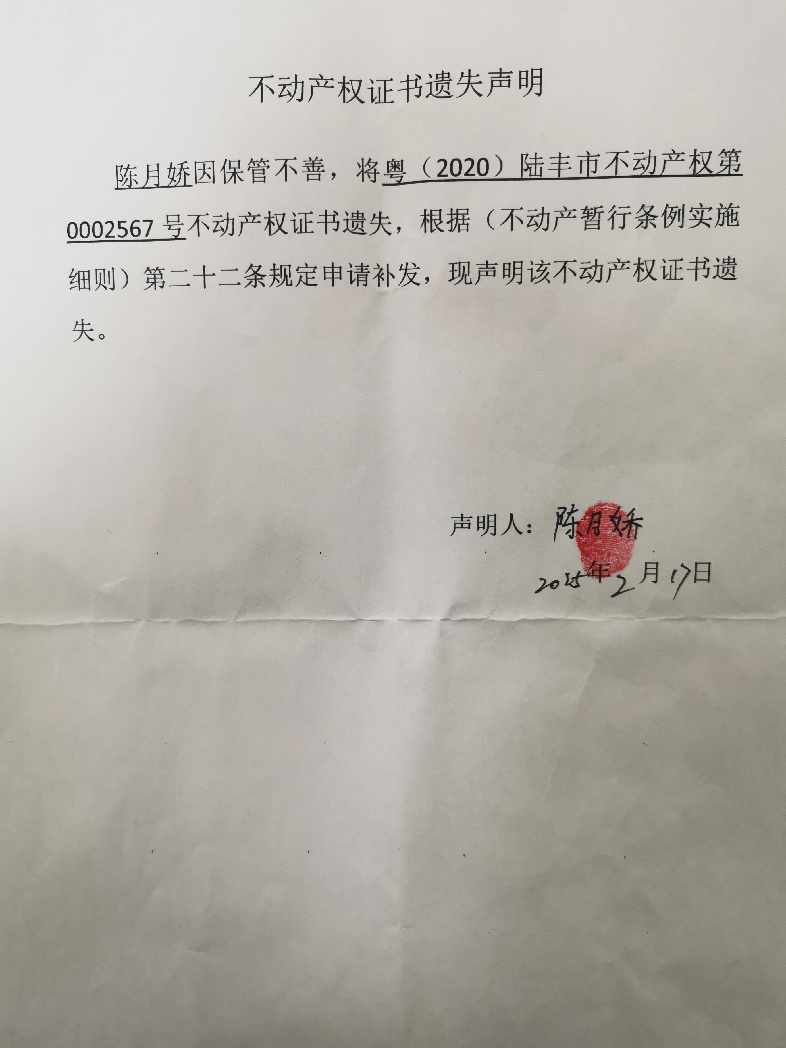 权利人因《不动产权证书》遗失,现向我局申请补发新权属证书,根据《不动产登记暂行条例实施细则》第二十二条的规定,现公告作废。我机构将按规定给予补办理补证登记。
