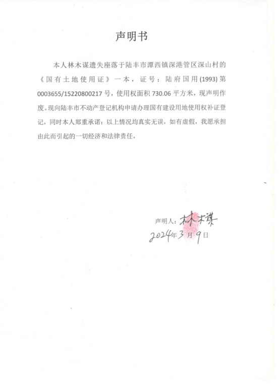 林木谋因《国有土地使用证》遗失向我局申请补发新证书,根据《不动产登记暂行条例实施细则》第二十二条的规定,现公告作废,如有异议,请自本公告之日起十五个工作日内(2025年3月31日之前)将异议书面材料送达我机构,逾期无人提出异议或者异议不成立的,我机构将予以补证登记。