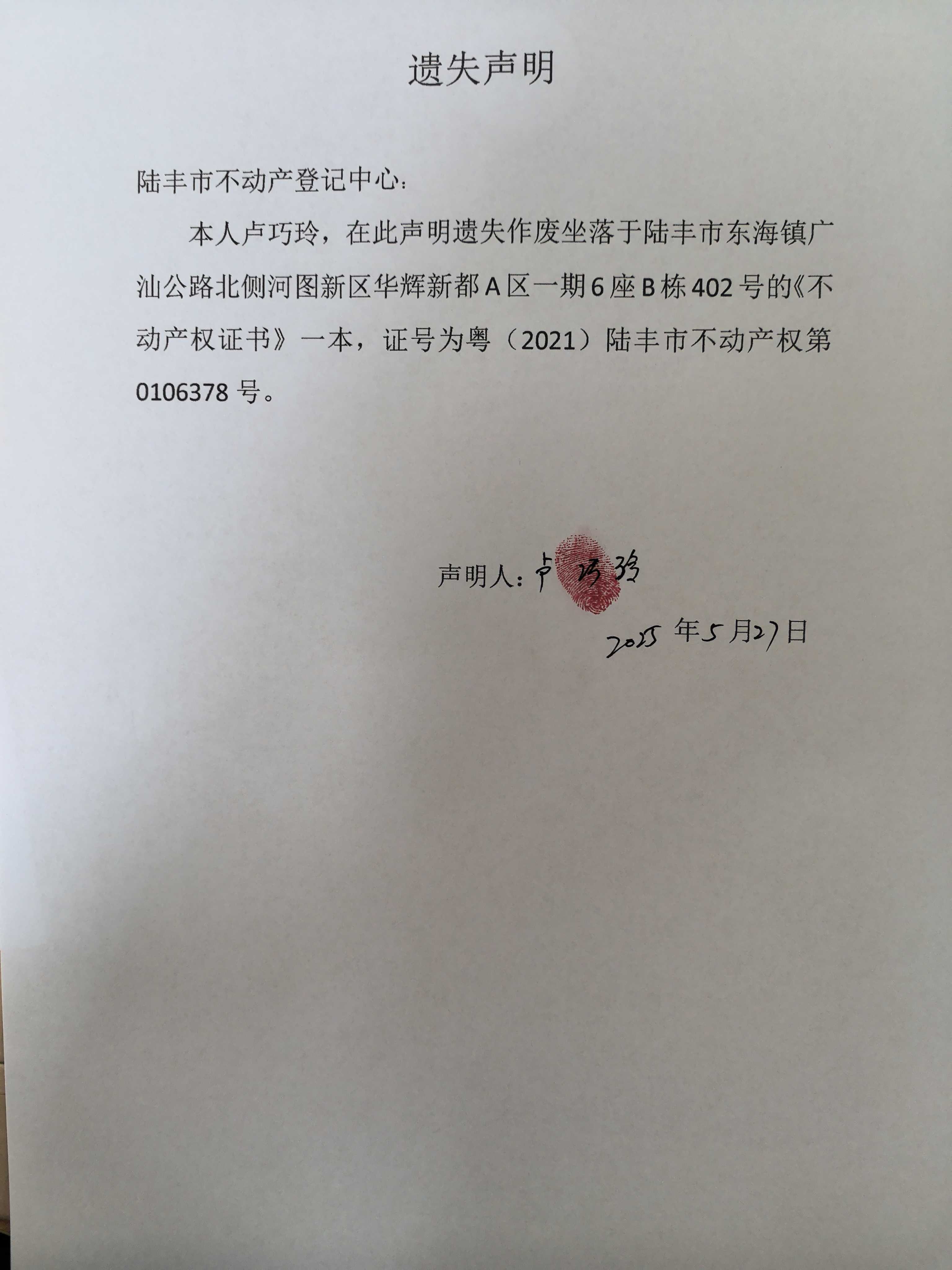 权利人因《不动产权证书》遗失,现向我局申请补发新权属证书,根据《不动产登记暂行条例实施细则》第二十二条的规定,现公告作废。我机构将按规定给予补办理补证登记。