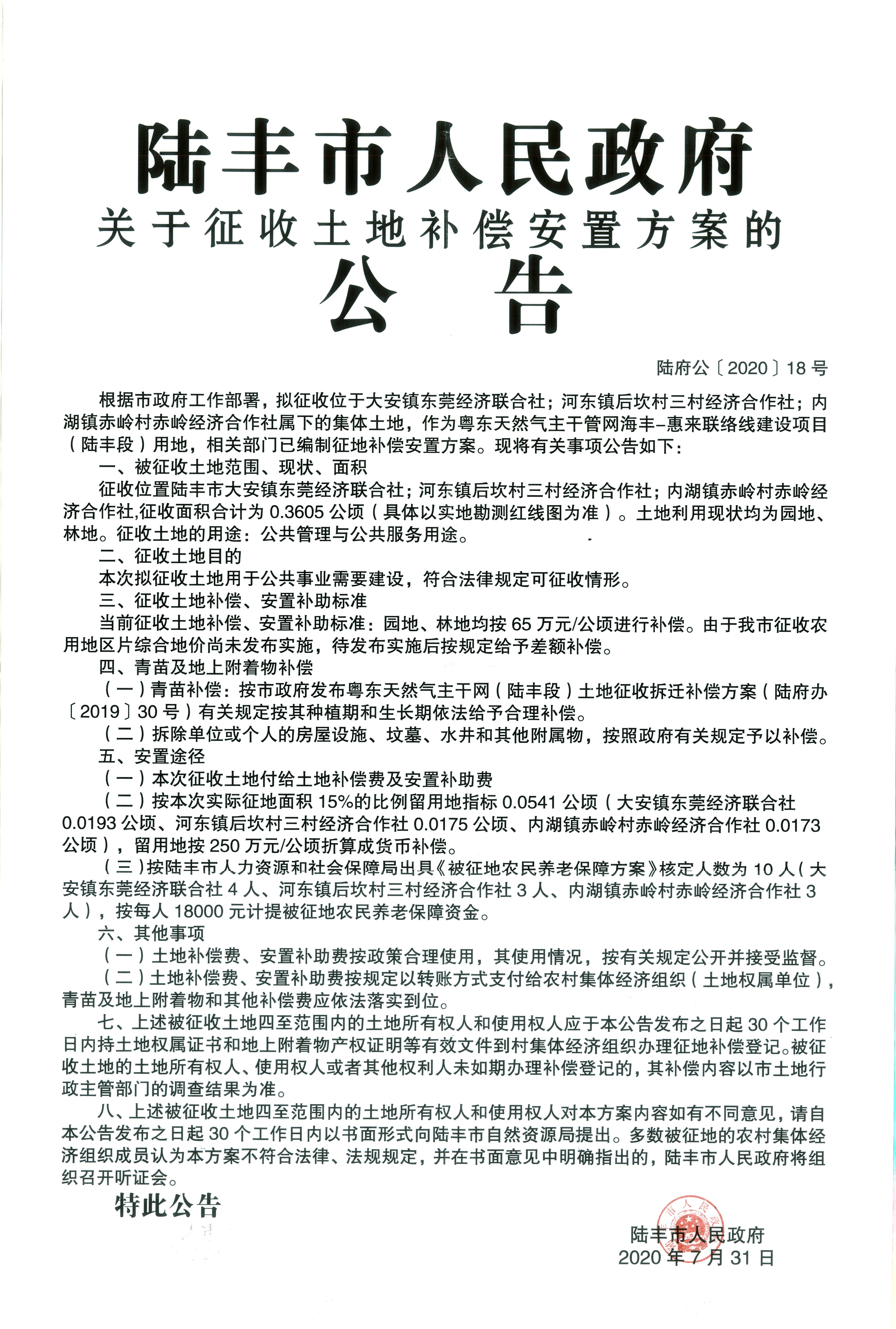 苹果直播 关于征收土地补偿安置方案的公告(陆府公(2020)18号)