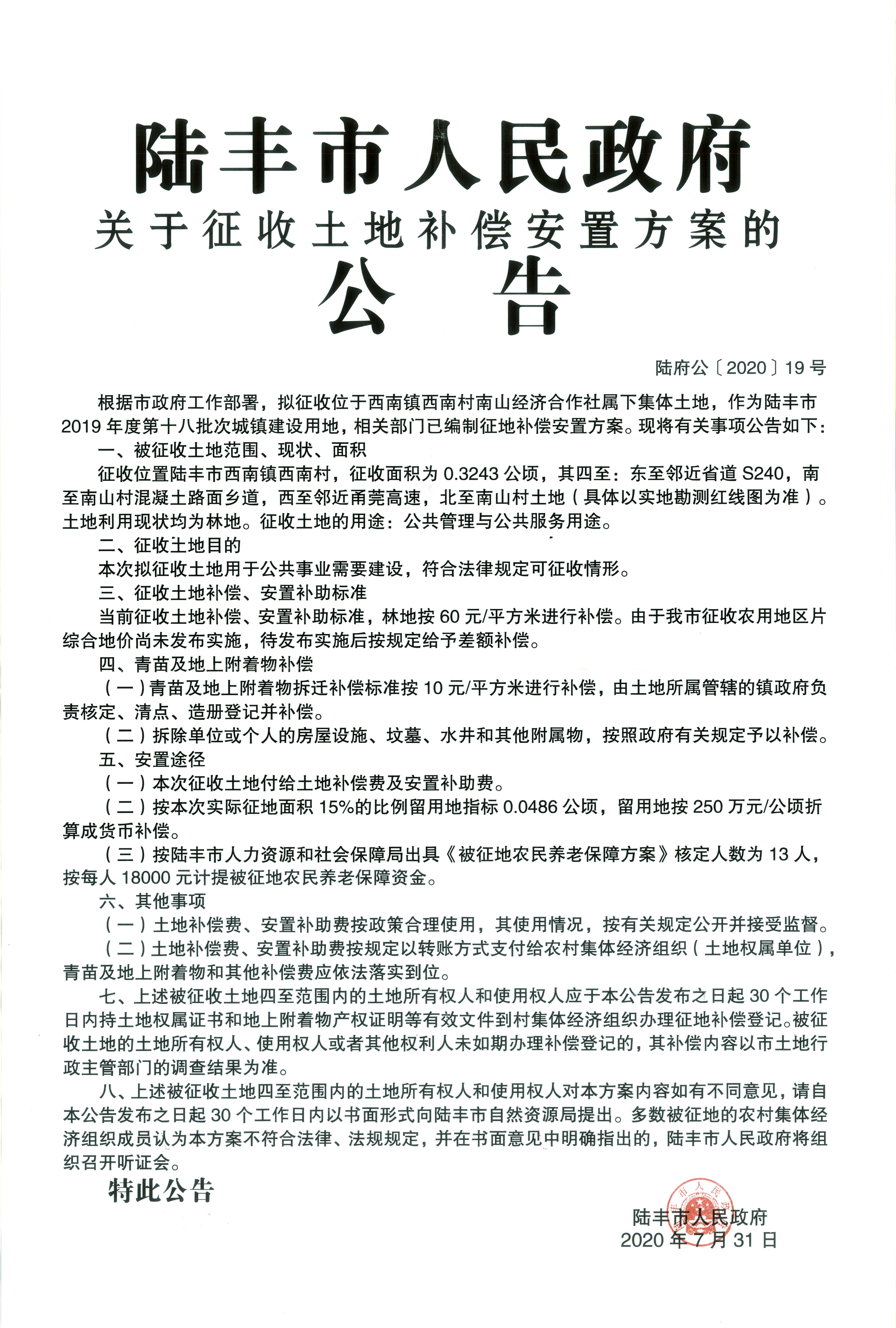 苹果直播 关于征收土地补偿安置方案的公告(陆府公(2020)19号)