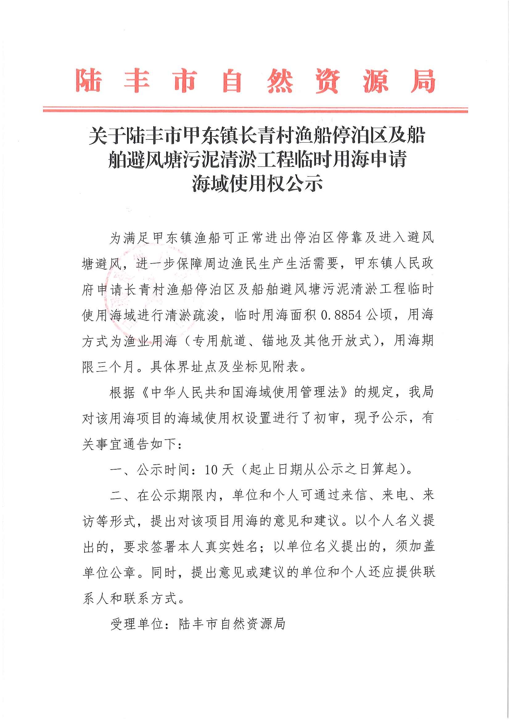 关于苹果直播 甲东镇长青村渔船停泊区及船舶避风塘污泥清淤工程临时用海申请海域使用权的公示