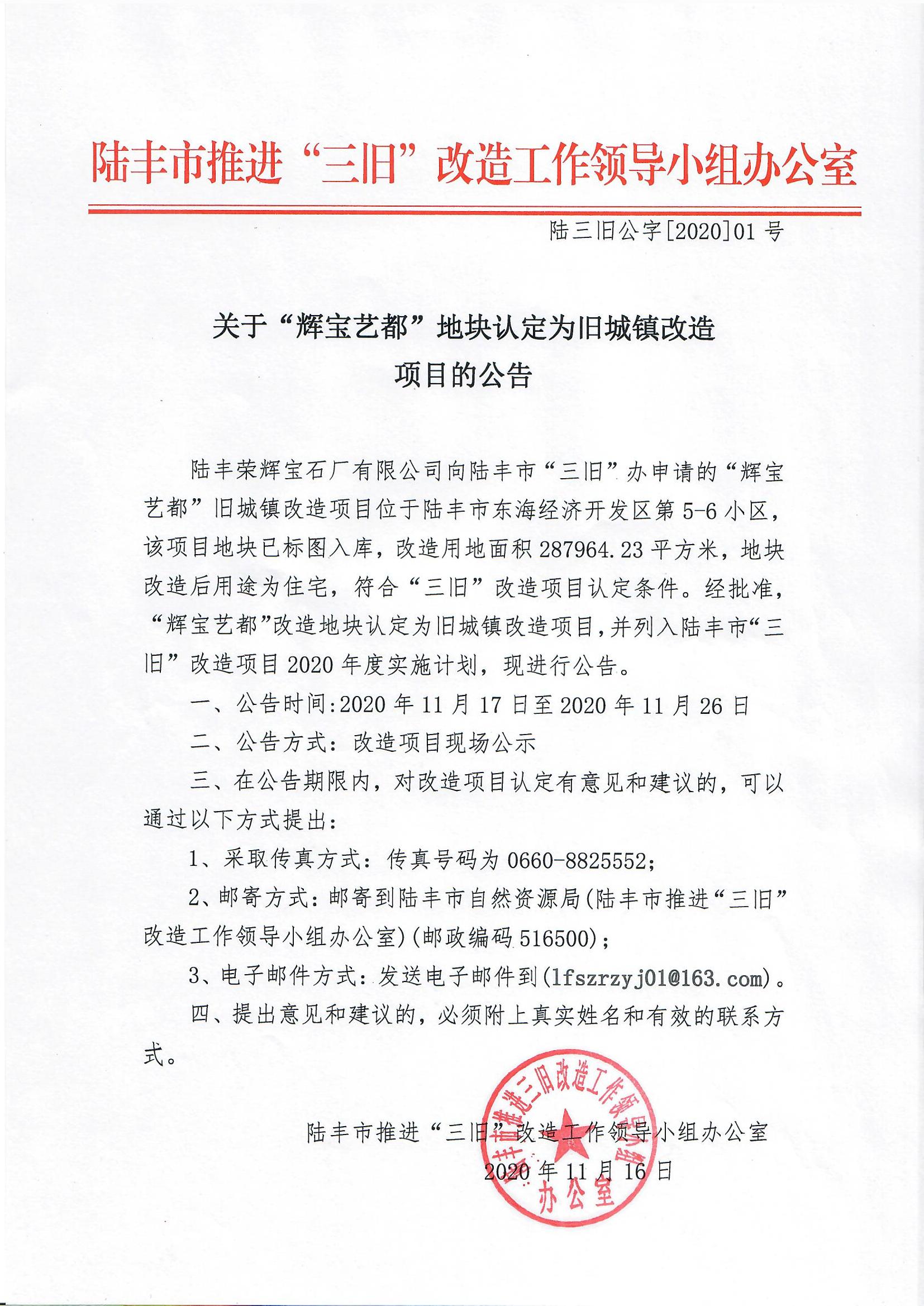 关于“辉宝艺都”地块认定为旧城镇改造项目的公告