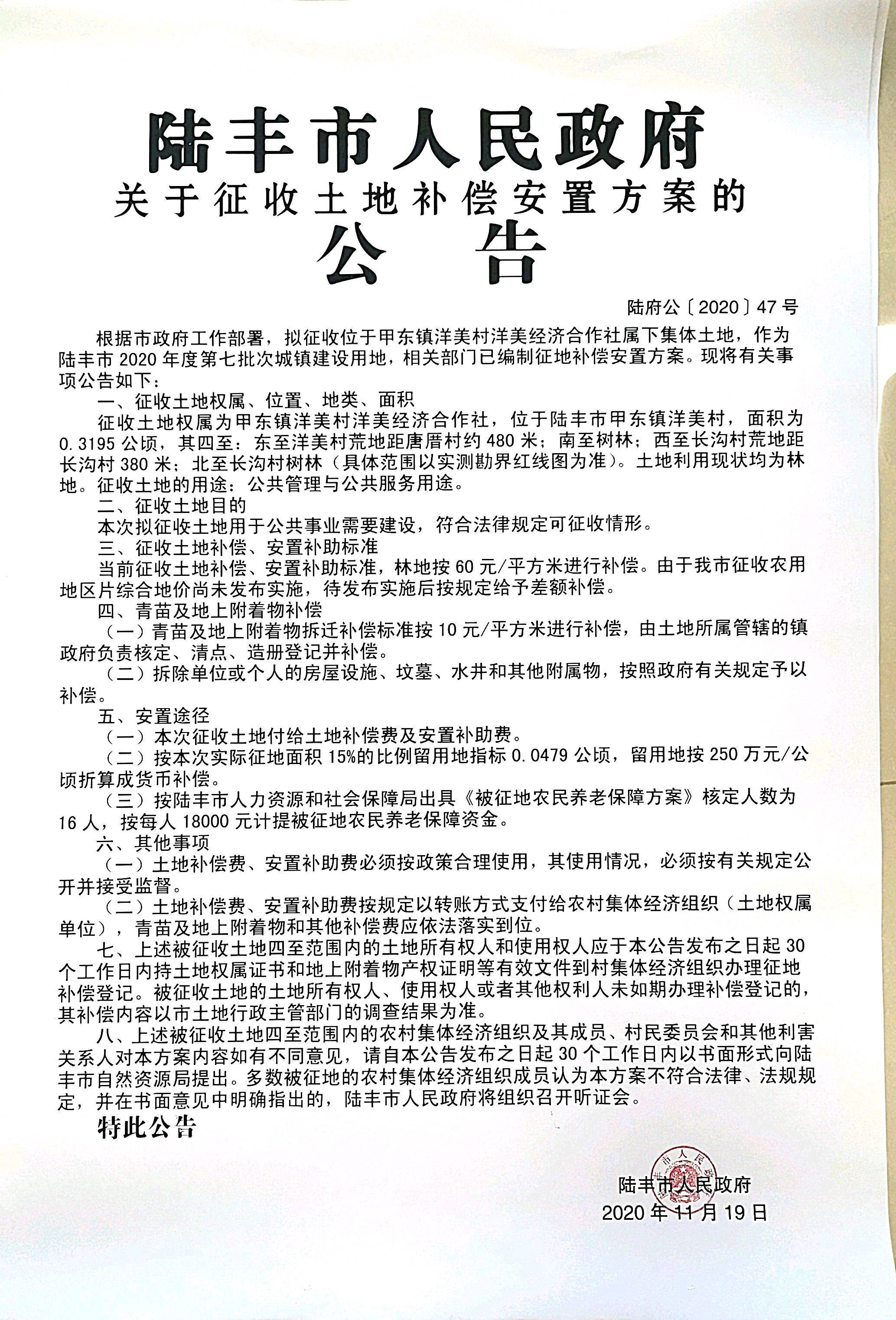 苹果直播 关于征收土地补偿安置方案的公告-陆府公[2020]47号