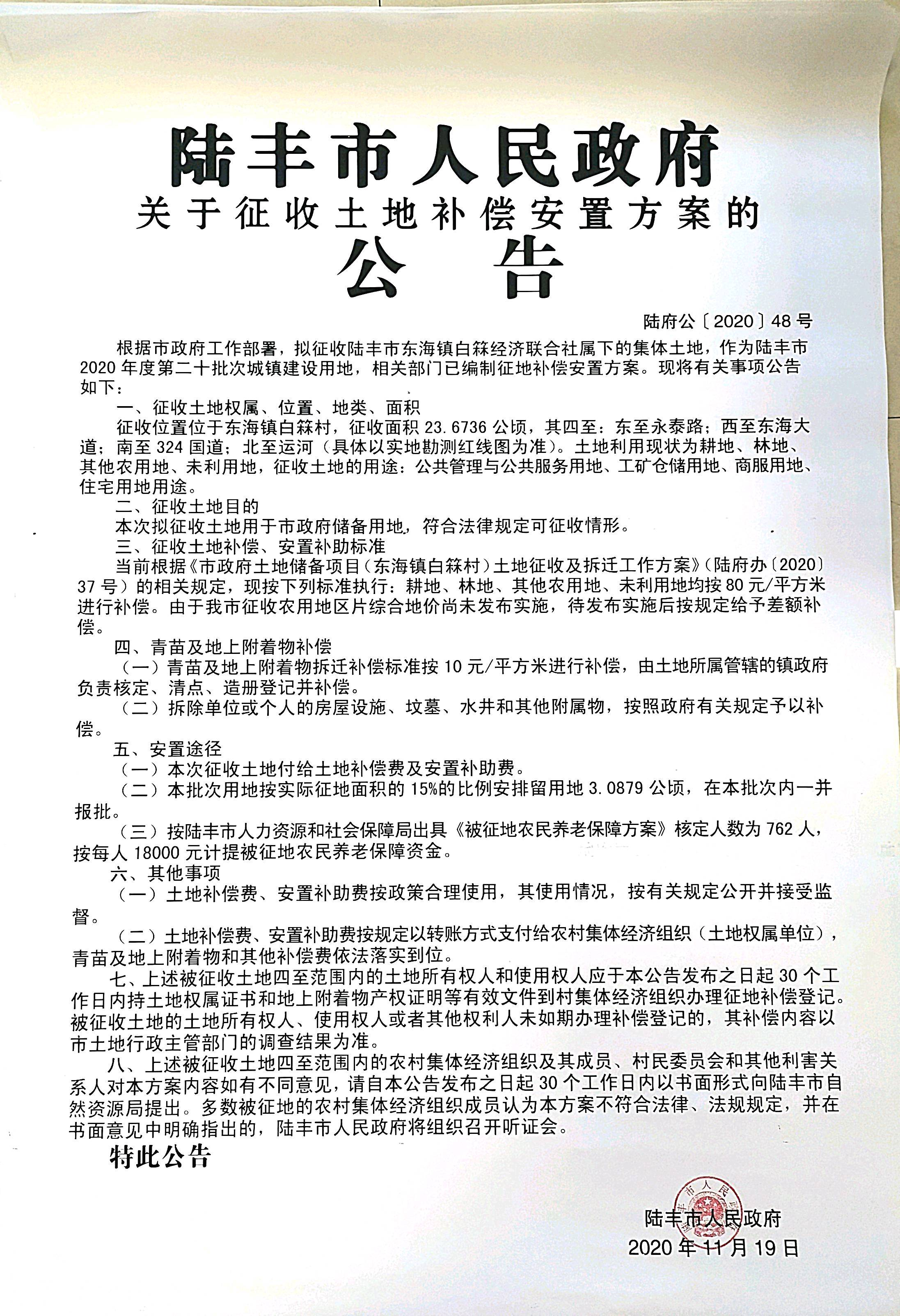 苹果直播 关于征收土地补偿安置方案的公告-陆府公[2020]48号