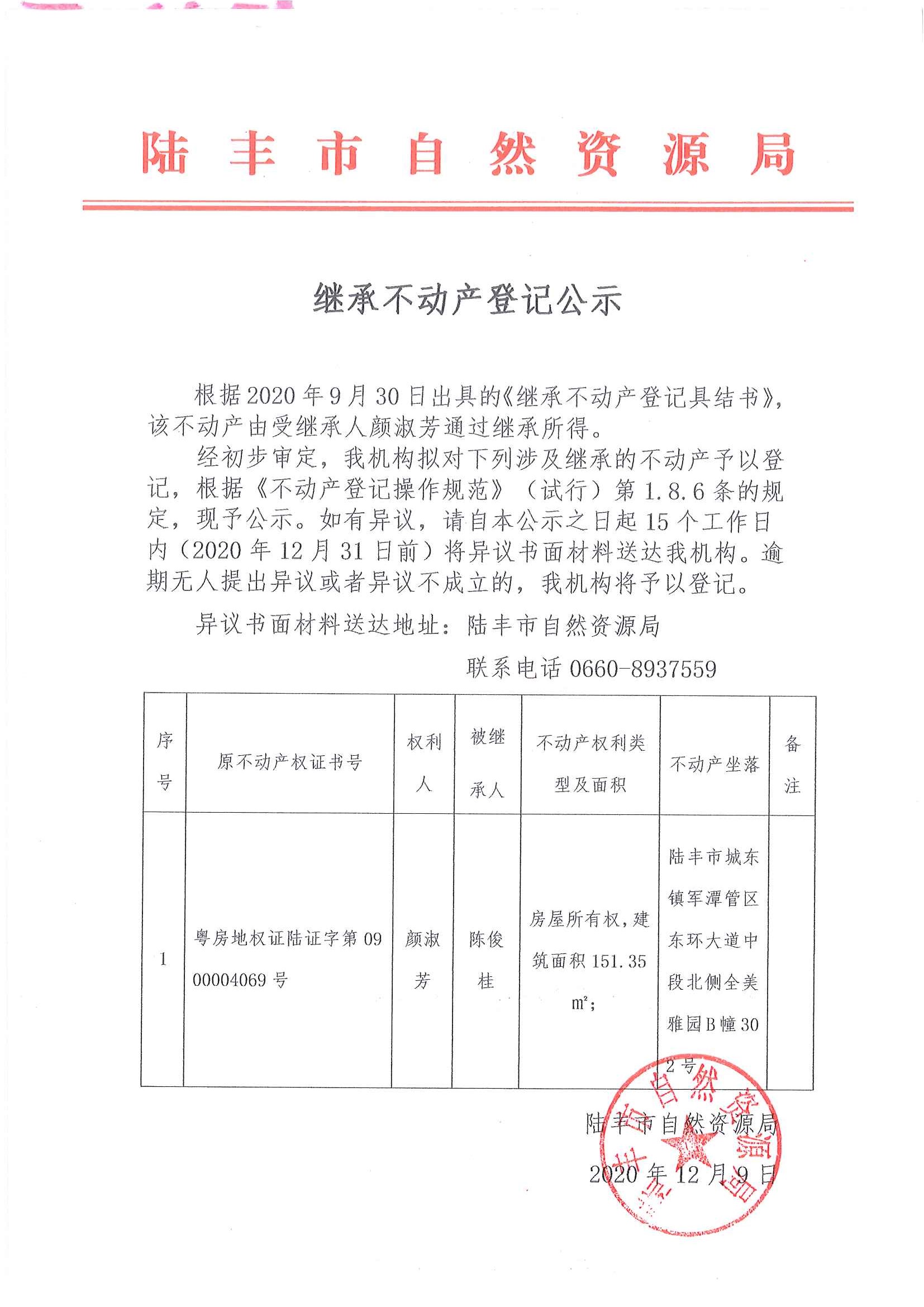 继承不动产权登记公示(颜淑芳)
