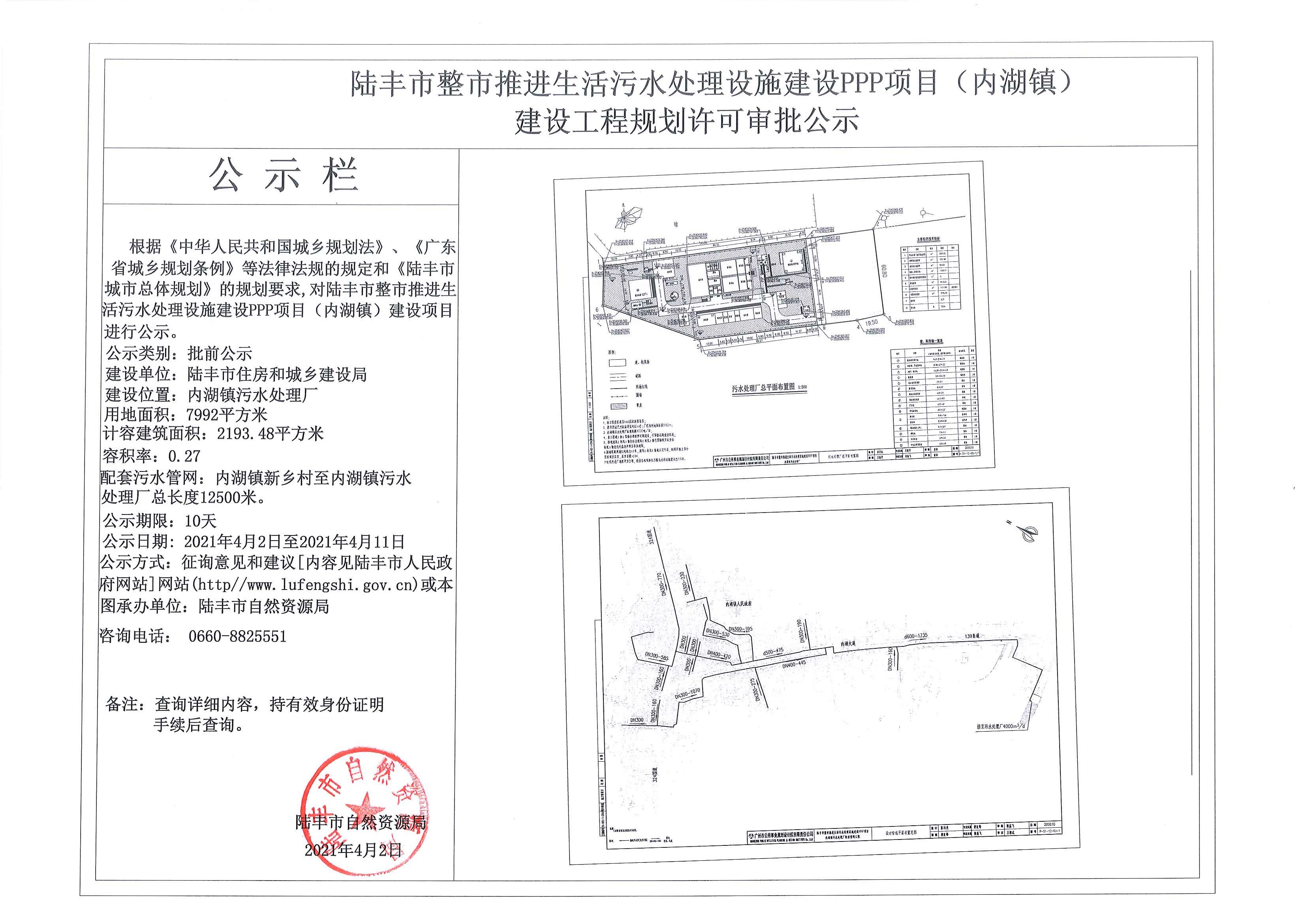 苹果直播 整市推进生活污水处理设施建设PPP项目(内湖镇)建设工作规划许可审批公示