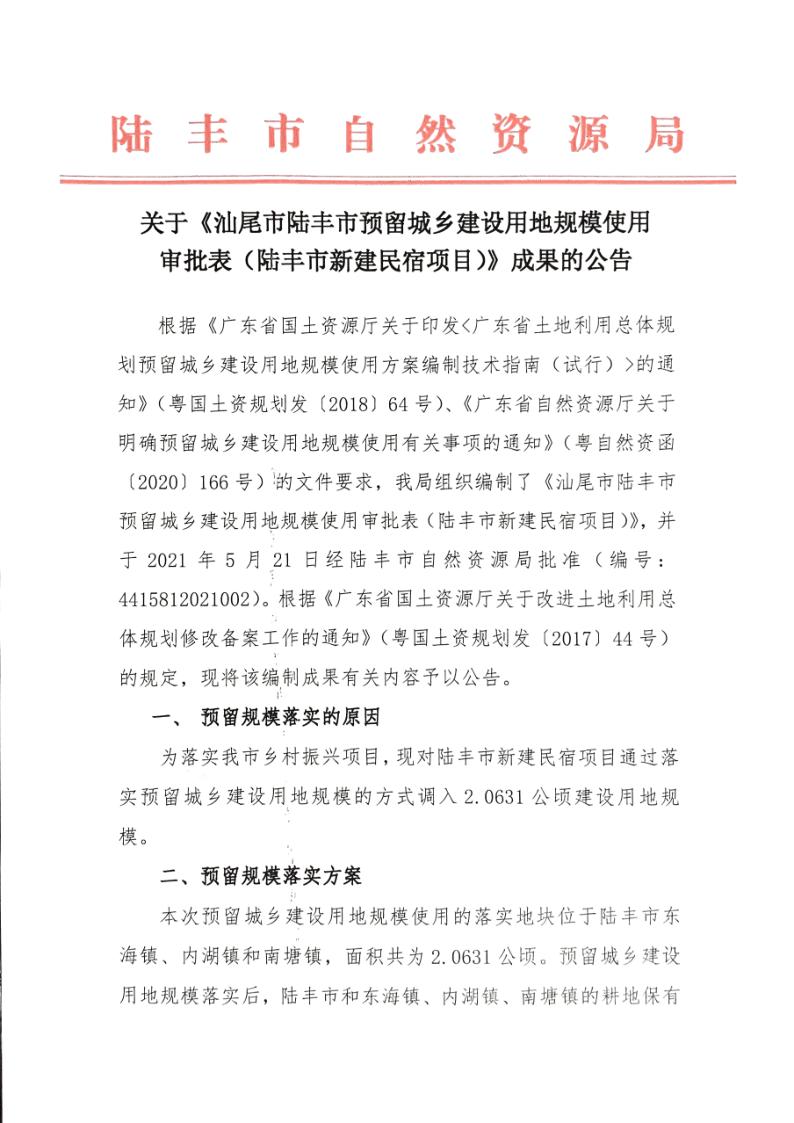 关于《汕尾市苹果直播 预留城乡建设用地规模使用审批表(苹果直播 新建民宿项目)》成果的公告