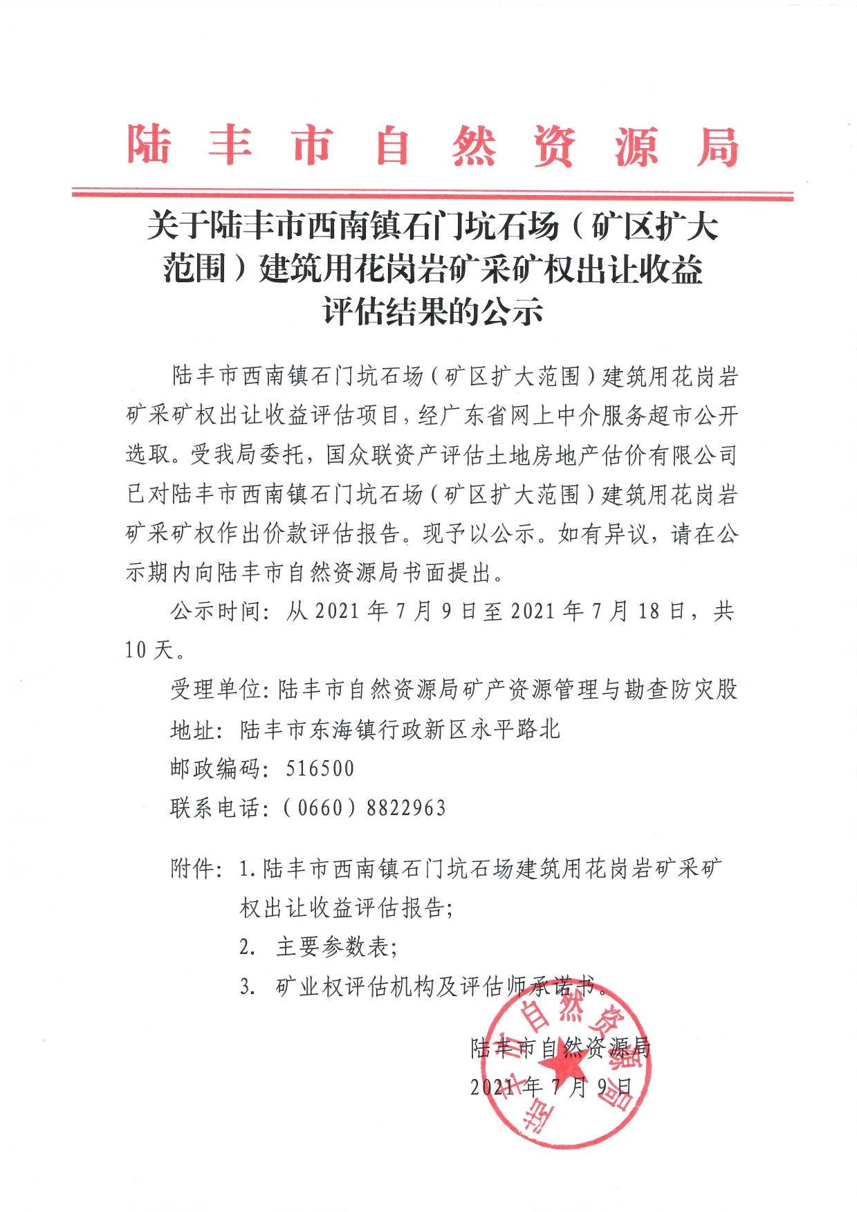 关于苹果直播 西南镇石门坑石场(矿区扩大范围)建筑用花岗岩矿采矿权出让收益评估结果的公示