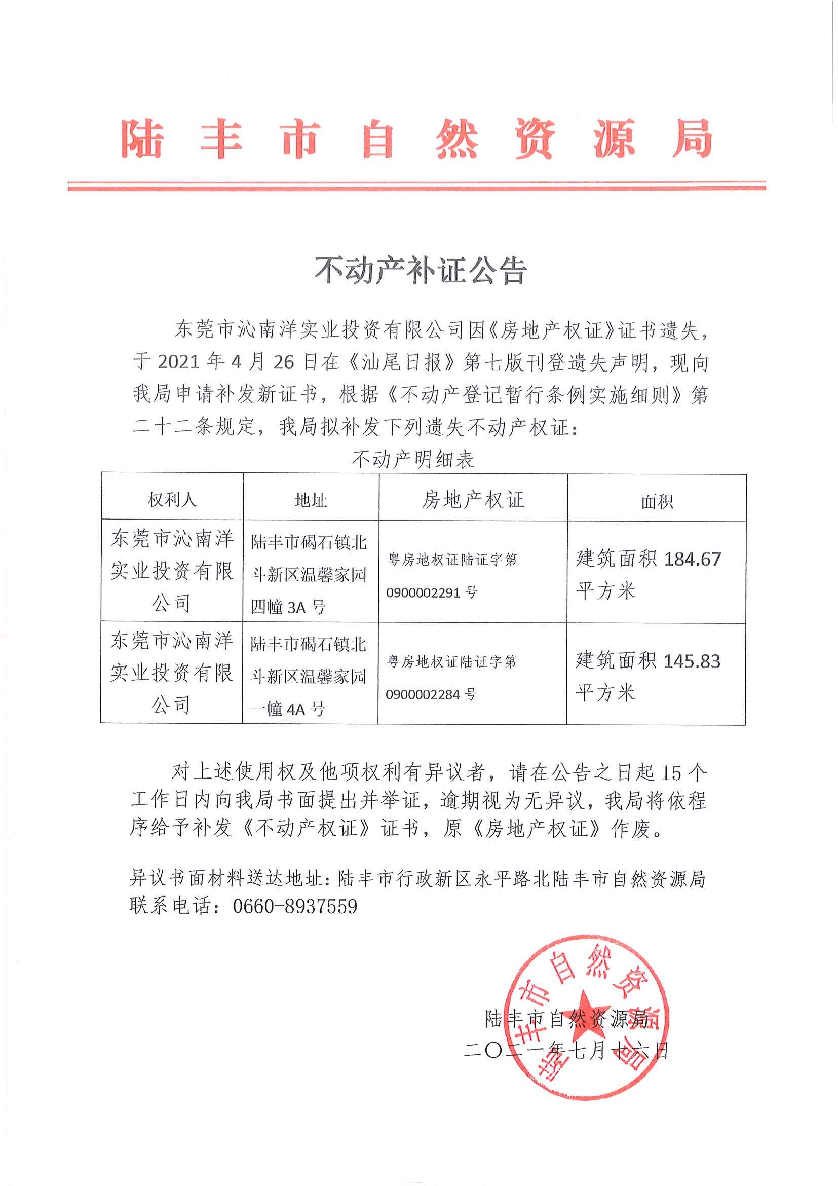 不动产补证公告(东莞市沁南洋实业投资有限公司)