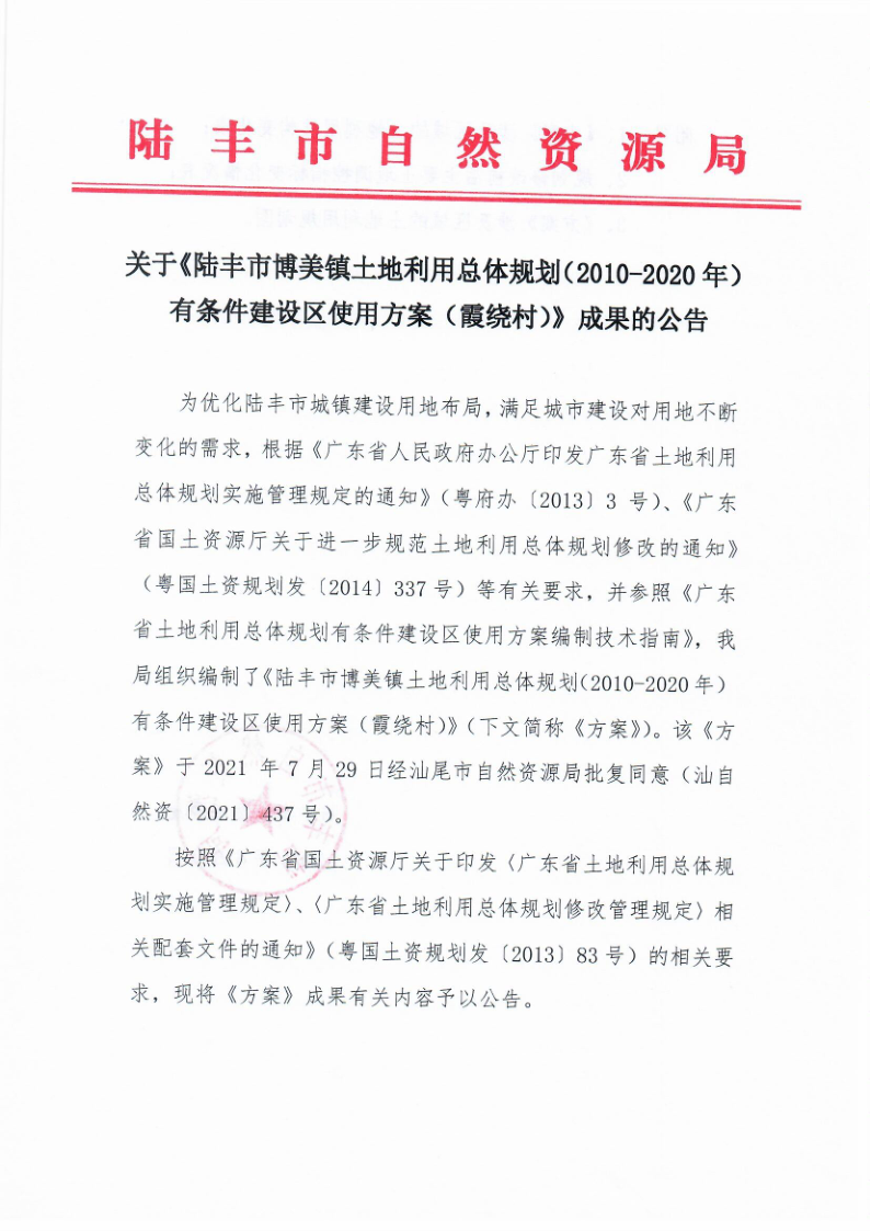 关于《苹果直播 博美镇土地利用总体规划(2010-2020年)有条件建设区使用方案(霞绕村)》成果的公告