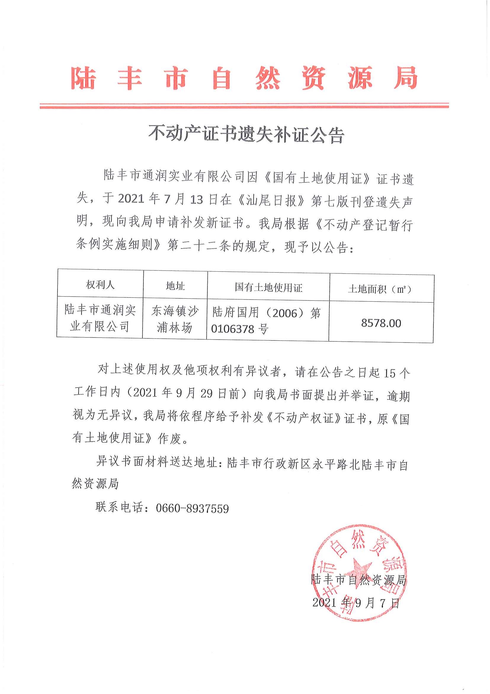 不动产证书遗失补证公告(苹果直播 通润实业有限公司)