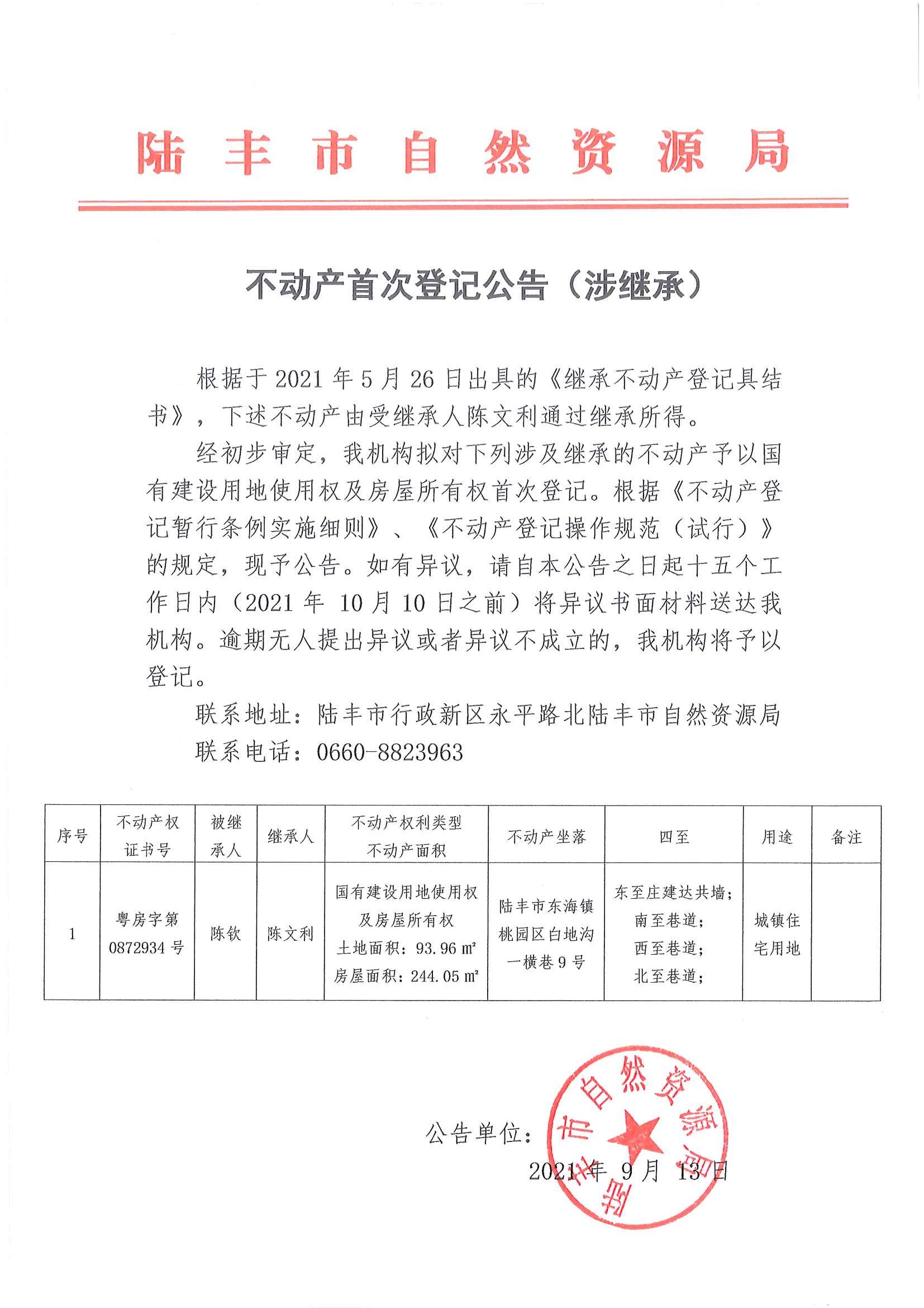 不动产首次登记公告(涉继承)