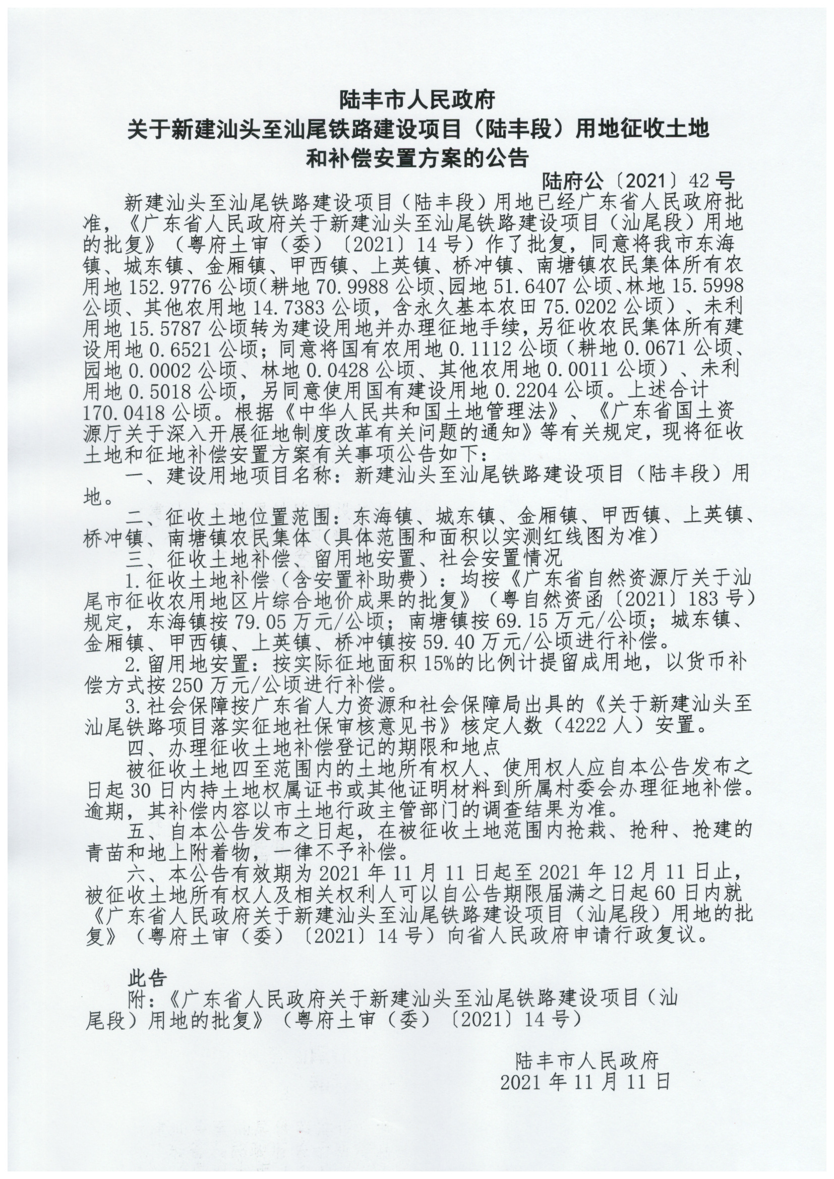 广东省人民政府关于新建汕头至汕尾铁路建设项目(汕尾段)用地的批复(粤府土审(委)〔2021〕14号)
